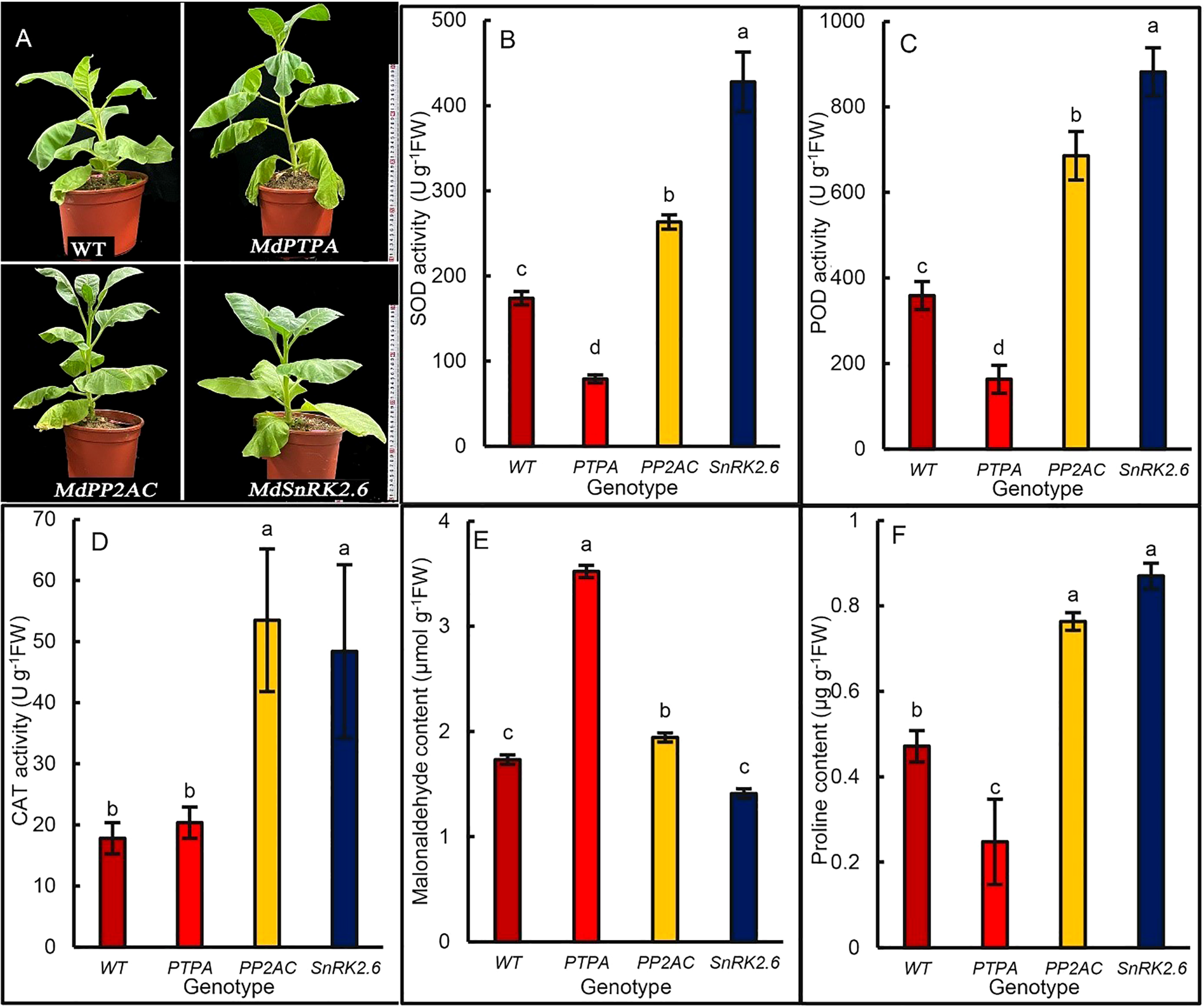 Plant appearance and biochemical differences among genotypic tobaccos after osmotic stress. The 45-day old potted tobacco plants were treated with 15% polyethylene glycol 6000 for 12 d, and the antioxidant enzyme activities and proline content were measured. (A) Growth phenotype of different genotypes of tobacco plants, where MdPTPA, MdPP2AC and MdSnRK2.6 were the transgenic tobacco, respectively. The MdPTPA transgenic tobacco wilted more severely than MdPP2AC and MdSnRK2.6 plants. (B–D) the activity of superoxide dismutase (SOD), peroxidase (POD) and catalase (CAT), respectively; (E) the content of malondialdehyde (MDA), (F) the proline content. The values are the means ± SE from three biological replicates. The same letters indicate no significant differences at P = 0.05 level.