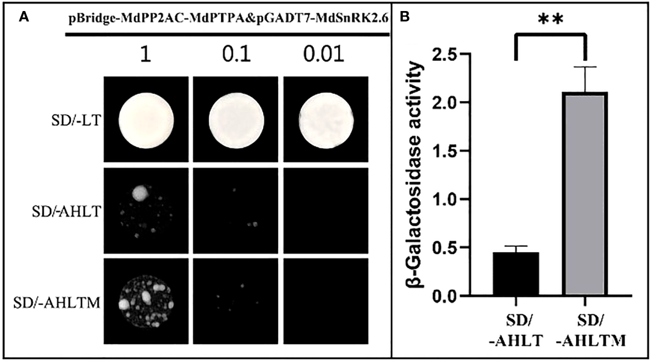 MdPTPA promoting the interaction of MdPP2AC with MdSnRK2.6 demonstrated by Yeast three-hybrid. (A) Yeast three-hybrid (Y3H) assay, which shows that MdPTPA promotes the interactions between MdPP2AC and MdSnRK2.6. SD/-LT: SD/-Leu/-Trp, SD/-AHLT: SD/-Ade/-His/-Leu/-Trp, SD/-AHLT/M: SD/-Ade/-His/-Leu/-Trp/Met. Three independent repeated experiments were performed with similar results. (B) β-galactosidase activity assay. The data are the means ± SE of three biological replicates and the symbol ** represents the difference significant at p = 0.01.