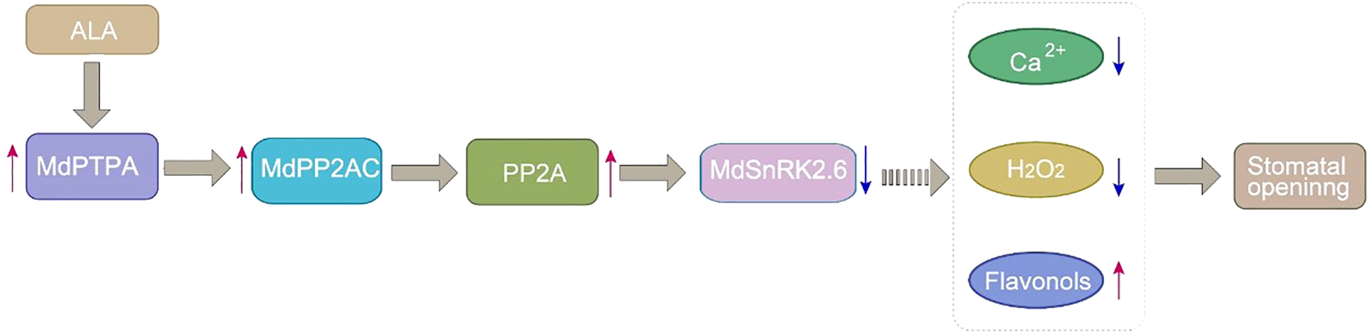 SRK2E/OST1/SnRK2.6 is a key positive factor of the ABA signaling pathway (Mustilli et al., 2002; Li et al., 2021). SnRK2.6 phosphorylation and dephosphorylation controls stomatal closing and opening (Mustilli et al., 2002; Yoshida et al., 2002). In the previous study, we demonstrated that SnRK2.6 functioned at the downstream of PP2A signaling, involved in ALA-ABA regulation of apple stomatal movement (Chen et al., 2023). Based on these studies, we hypothesized that ALA positively regulated PTPA and PP2AC expression to enhance PP2A activity, and then negatively regulated SnRK2.6 activity, which finally promoted stomatal opening and improved leaf photosynthetic efficiency of plants. However, the hypothesis was verified in the detached apple leaves rather than living plants. More biological functions of the genes need to be explored.