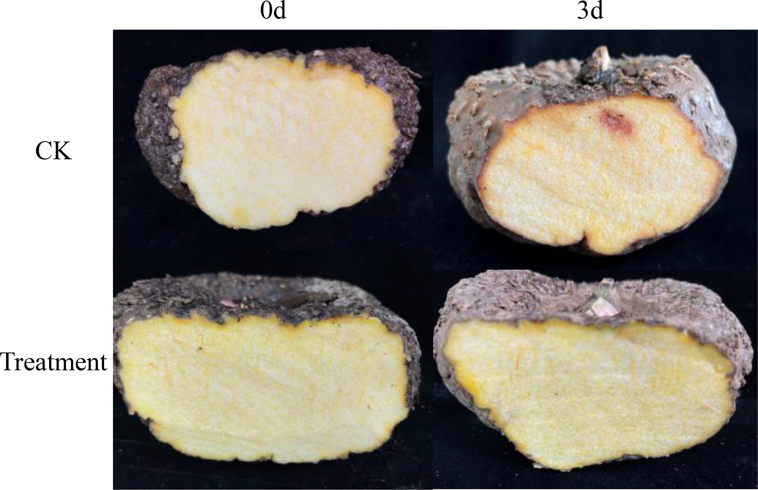 Symptoms of Amorphophallus muelleri corms after three days of inoculation with F. solani.