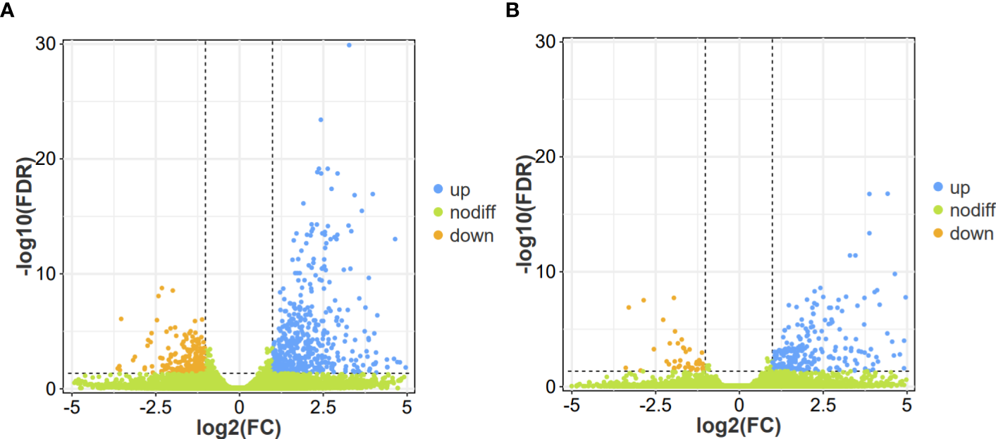 Volcano plot of differentially expressed genes (DEGs) identified in the leaf bud and flower bud corms of A. muelleri infected with F. solani. (A, B) Leaf bud corms (A) and flower bud corms (B) of A. muelleri at 3 d after F. solani infection.