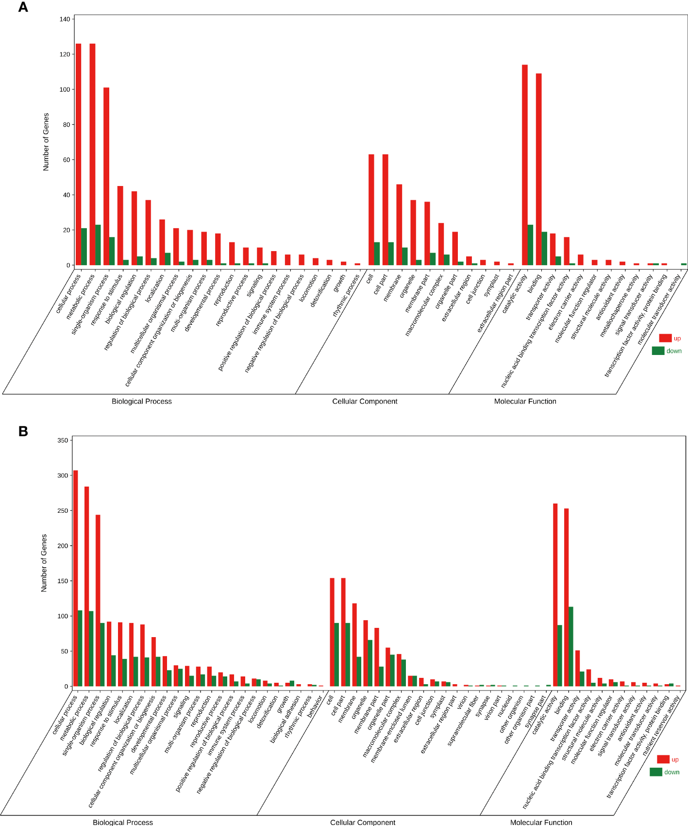 Gene Ontology bubble diagram of DEGs identified in the F. solani-infected leaf bud and flower bud corms of A. muelleri. (A, B) Leaf bud corms (A) and flower bud corms (B) of A. muelleri at 3 d after F. solani infection.