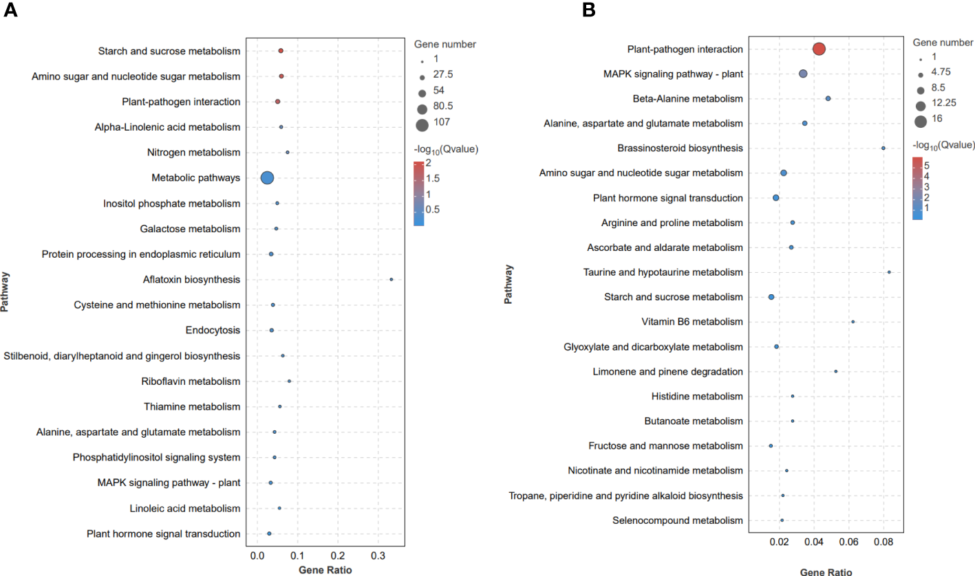 Kyoto Encyclopedia of Genes and Genomes (KEGG) bubble diagram of DEGs identified in the F. solani-infected leaf bud and flower bud corms of A. muelleri. (A, B) Leaf bud corms (A) and flower bud corms (B) of A. muelleri at 3 d after F. solani infection.