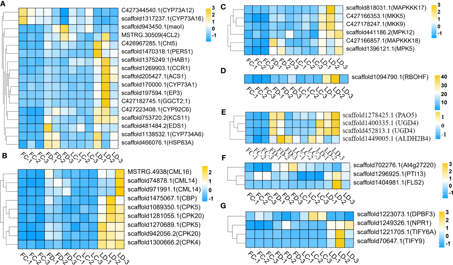 Heatmap of gene expression levels in the leaf bud corms and flower bud corms of A. muelleri infected with F. solani. The scale bar represents the expression level of each gene (FPKM) in different treatments, as indicated by yellow/blue rectangles. Genes in yellow were upregulated, and those in blue were downregulated. (A) Plant secondary metabolite biosynthesis pathway genes; (B) Ca2+ signaling pathway genes; (C) MAPK signaling pathway genes; (D) ROS metabolic pathway gene; (E) Ascorbic acid metabolism pathway genes; (F) PTI genes; (G) plant hormone signaling transduction pathway genes.
