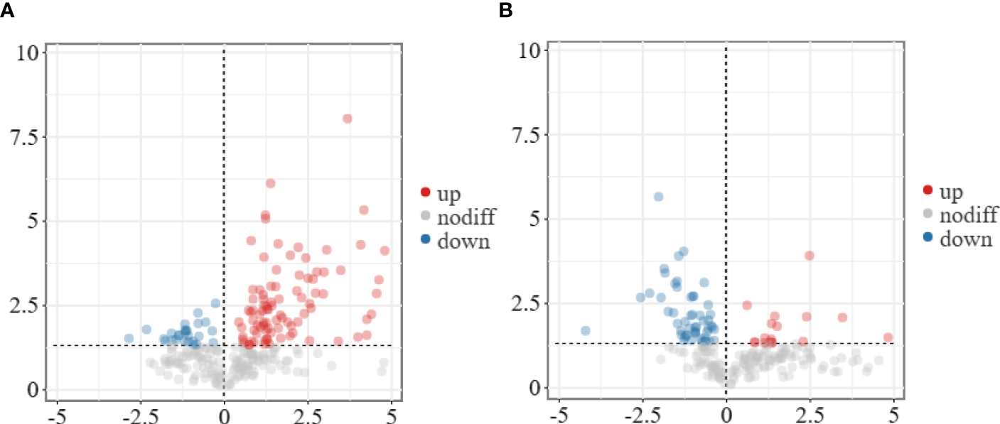 Volcano plot of DAMs identified in the leaf bud and flower bud corms of A. muelleri infected with F. solani. (A, B) Leaf bud corms (A) and flower bud corms (B) of A. muelleri at 3 d after F. solani infection.