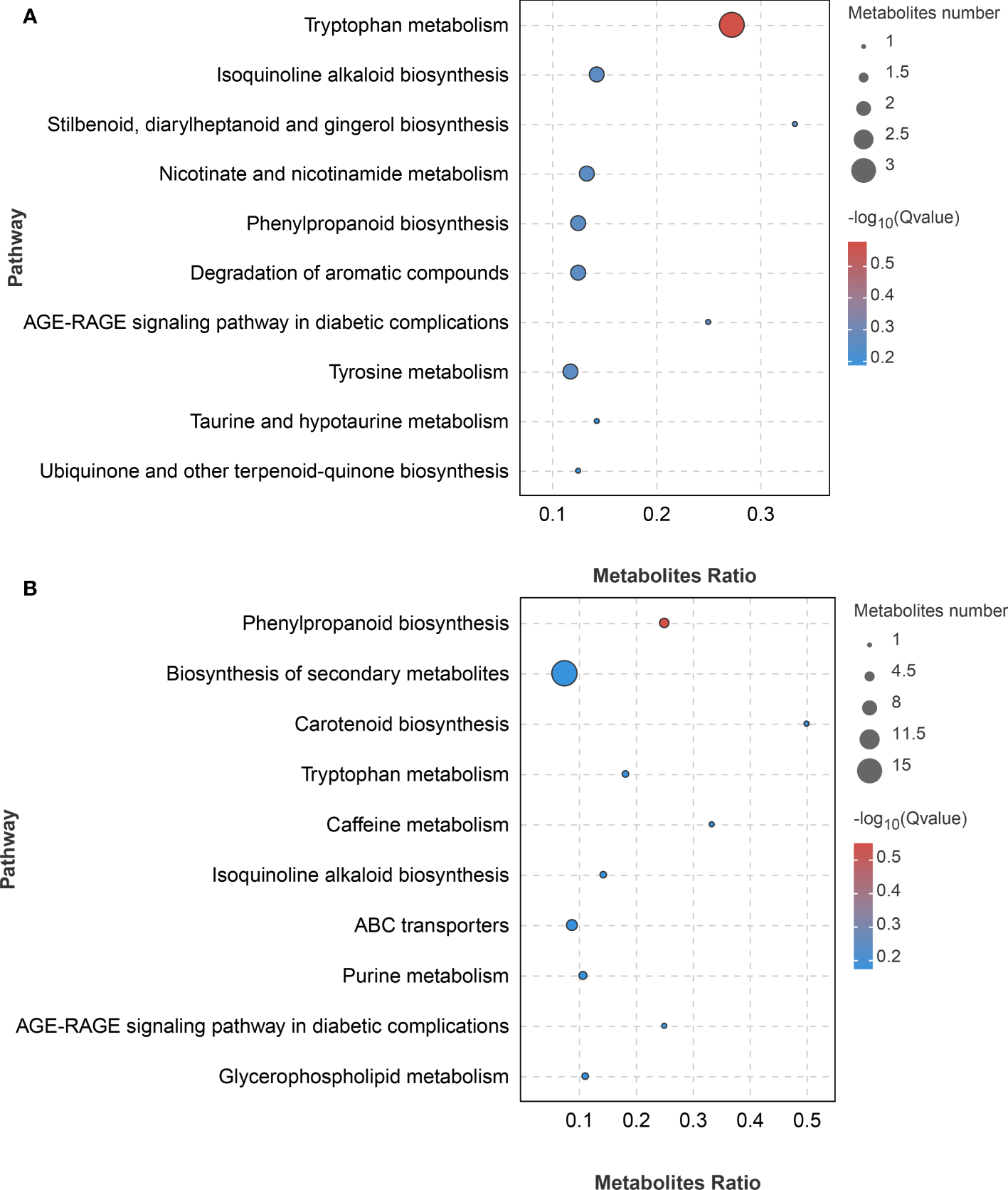 KEGG bubble diagram of DAMs identified in F. solani-infected leaf bud and flower bud corms of A. muelleri. (A, B) Leaf bud corms (A) and flower bud corms (B) of A. muelleri at 3 d after F. solani infection.