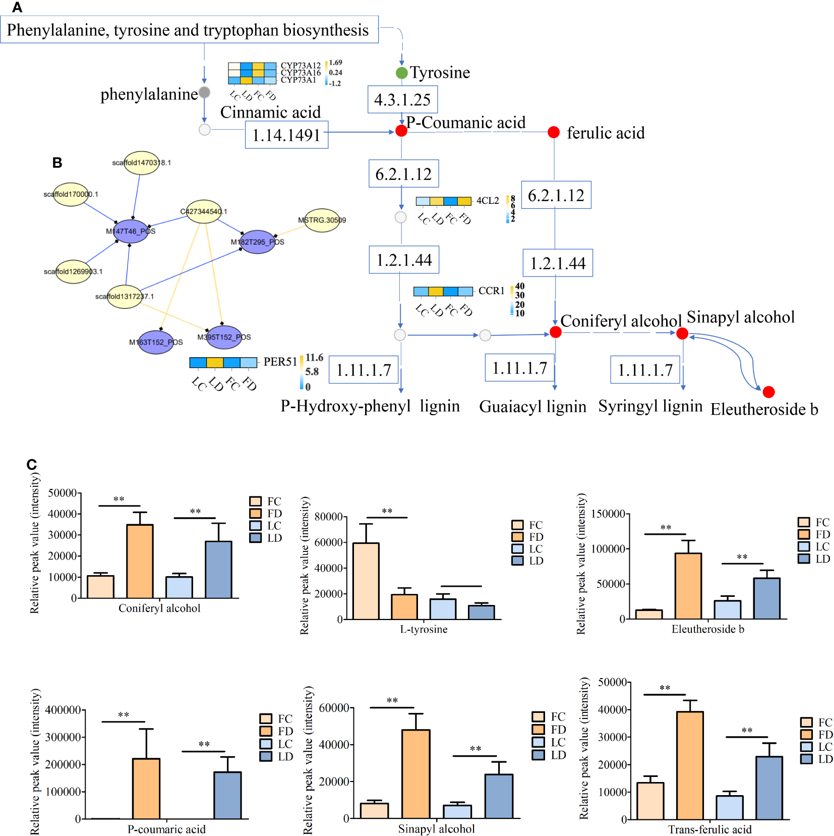 Schematic of the phenylpropane biosynthesis pathway. (A, B) Correlation diagram (A), correlation network diagram of DEGs and DAMs (B), and histogram of the relative content of DAMs involved in the phenylpropane biosynthesis pathway (C). MSTRG.30509: 4-coumarate-CoA ligase (4CL2); scaffold1470318.1: peroxidase (PER51); C427344540.1: trans-cinnamate 4-monooxygenase (CYP73A12); scaffold1317237.1: trans-cinnamate 4-monooxygenase (CYP73A16); scaffold170000.1: trans-cinnamate 4-monooxygenase (CYP73A1); scaffold1269903.1: cinnamoyl-CoA reductase (CCR1); M182T295_POS: DL-tyrosine; M163T152_POS: coniferyl alcohol; M177T173_POS: trans-ferulic acid; M395T152_POS: eleutheroside b; M193T150_POS: sinapyl alcohol; M147T46_POS:P-coumaric acid. In (B), yellow line indicates negative regulation, and blue line indicates positive regulation. ** on the bars indicate significant differences at different infection times (Student’s t-test, P < 0.05).
