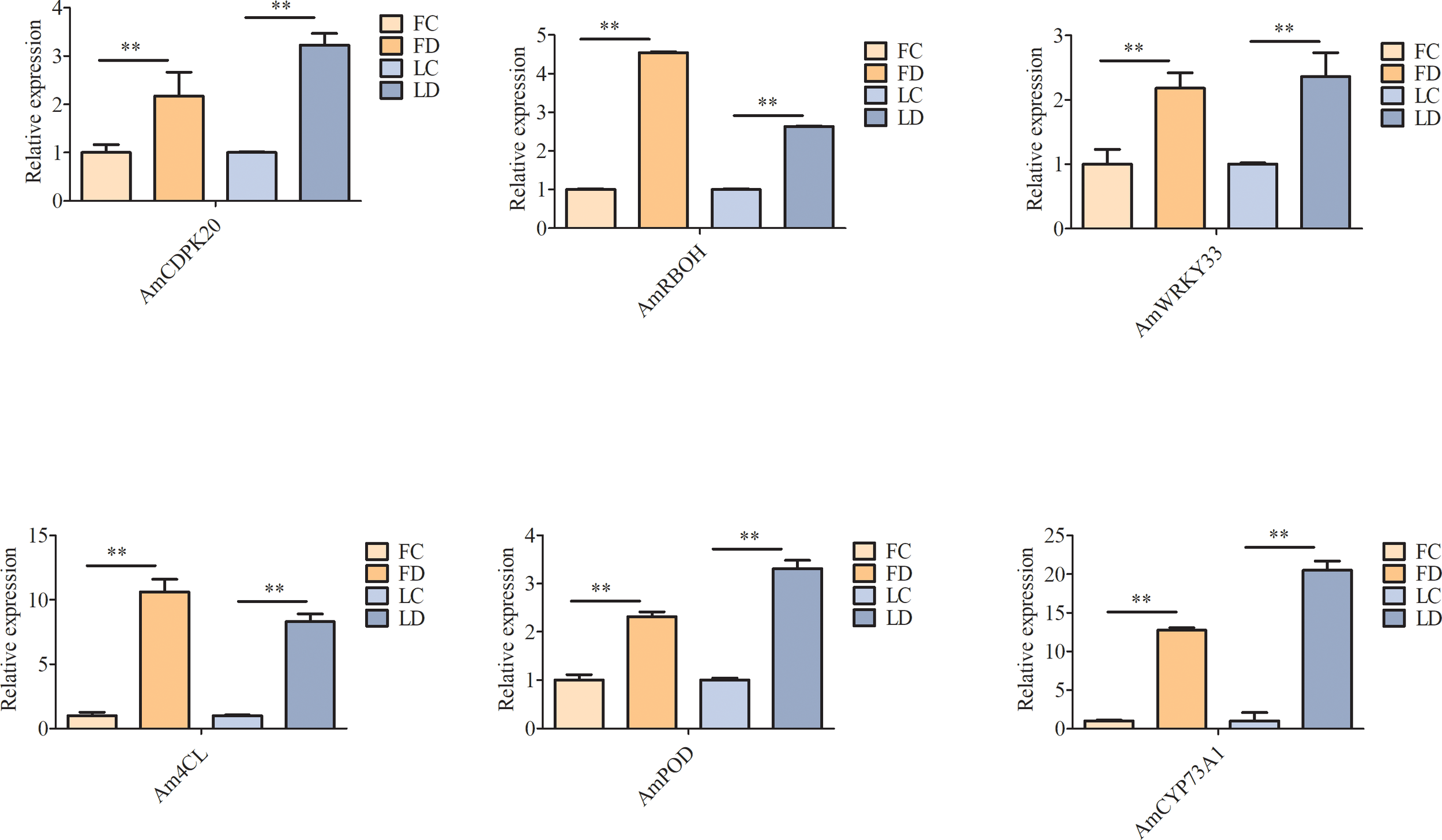 To determine whether the candidate DEGs were involved in the A. muelleri response to F. solani, we screened the expression of six genes, including three ‘plant-pathogen interaction’ pathway genes (AmCDPK20, AmRBOH, and AmWRKY33) and three ‘phenylpropane biosynthesis’ pathway genes (Am4CL, AmCYP73A1, and AmPOD), by qRT-PCR. The results showed that all six genes were significantly upregulated in A. muelleri after infection with F. solani (Figure 9), indicating that these six genes could be used as candidates to study the response of konjac to F. solani in future studies.