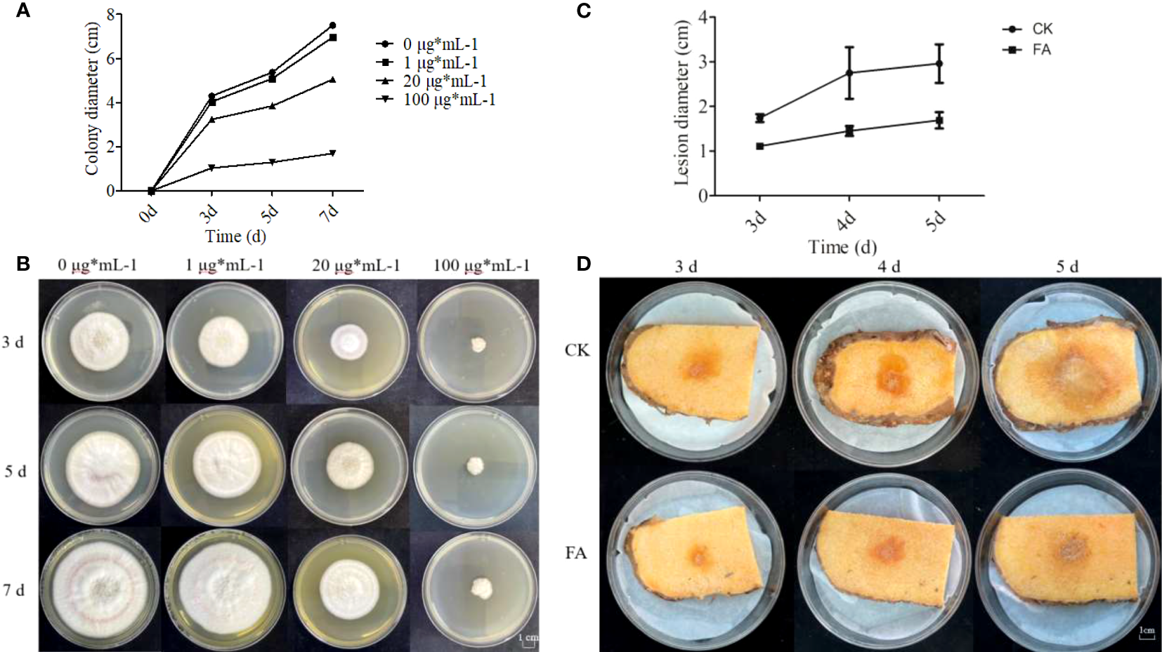 Antifungal activity of FA was evaluated by inoculating 3 μL of the conidial suspension (1 × 105 conidia per mL) on a 5-mm sterile filter paper disk placed in the center of a PDA plate containing increasing concentrations of FA (1, 20, 100 μg mL-1). The PDA plates were incubated at 28 °C. Colony growth was observed on the 3th, 5th and 7th day, the colony diameter of each group was measured with a vernier caliper, and the inhibition rate of strain growth was calculated. FA was dissolved in dimethyl sulfoxide (DMSO) for antifungal assays, and the maximum solvent amount for DMSO was 0.1% (v/v).