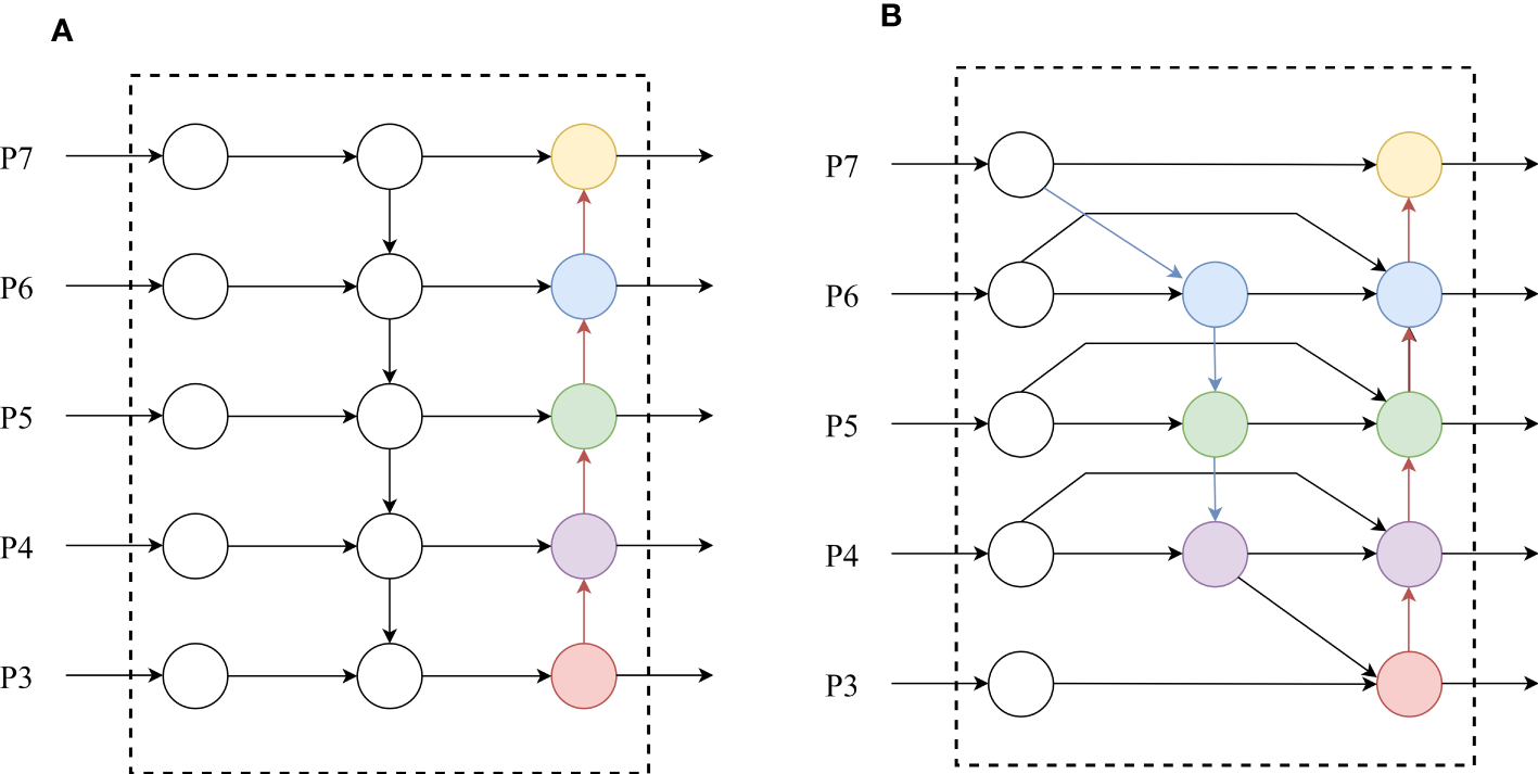 PANet structure diagram (A) and BiFPN structure diagram (B).