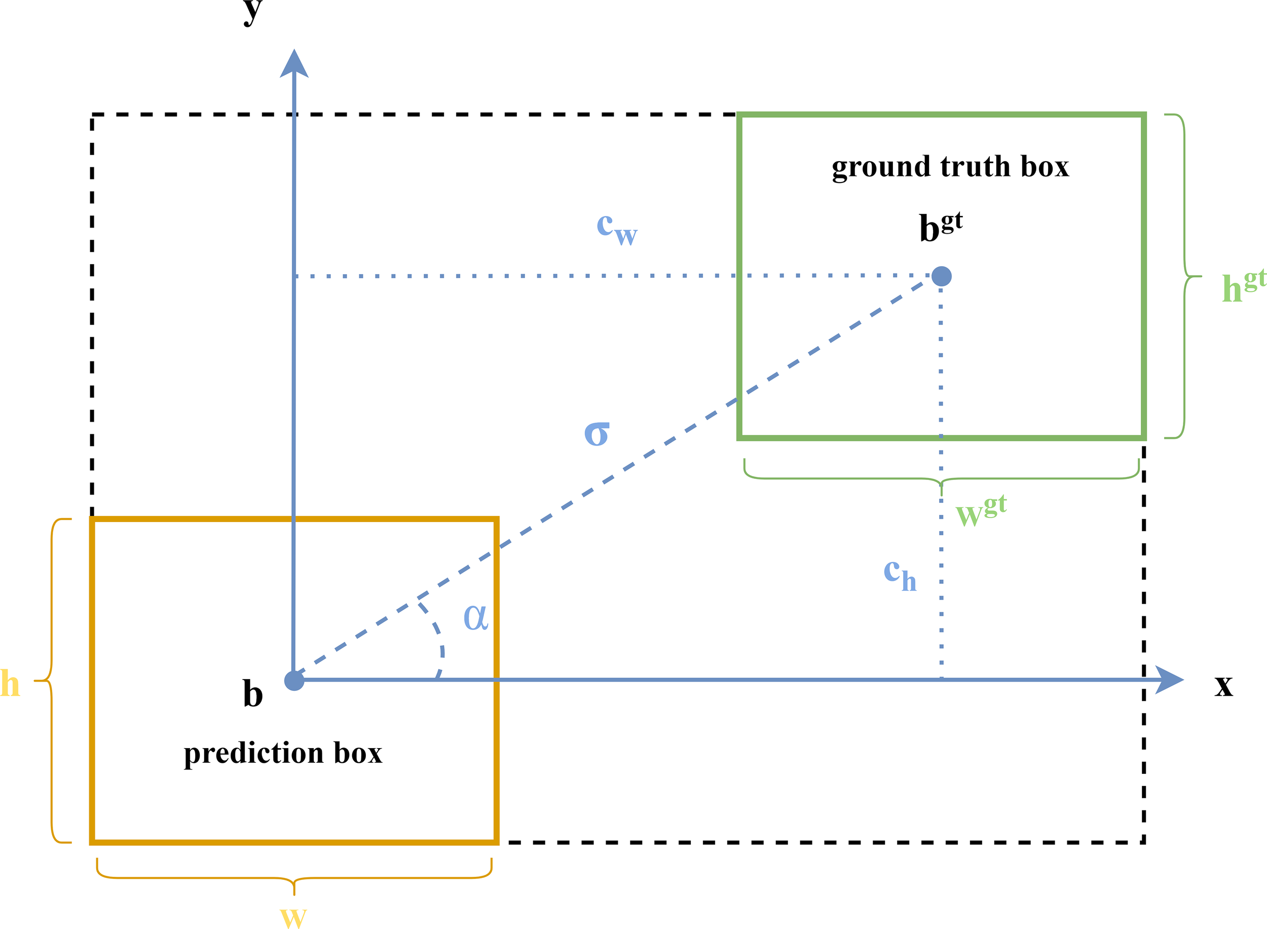 The component of Angle cost [as shown in equation (3)] enables the prediction bounding box to preferentially reach the x or y axis depending on the minimum distance from the x axis or y axis, and then continue to approach the ground truth box along the preferable axis, which can speed up the distance calculation between the two boxes.