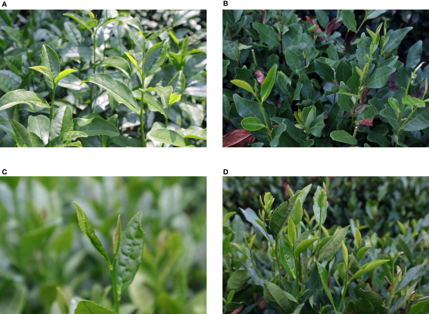 Tea bud samples under different environmental conditions: intense light environment (A); weak light environment (B); with a single-target sample (C); with multiple intensive target samples (D).