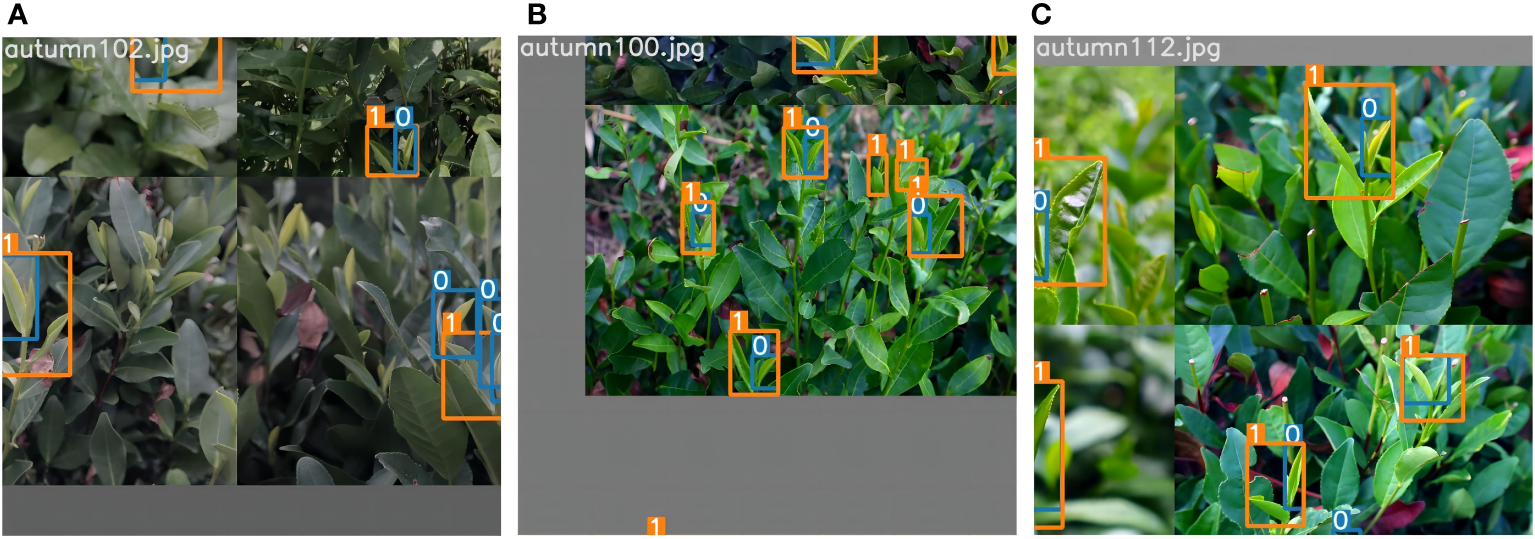 Tea image’s data enhancement effect: (A–C) represent the data enhancement effect after different methods. Use the numbers 0 and 1 to label the different grades of tea buds.