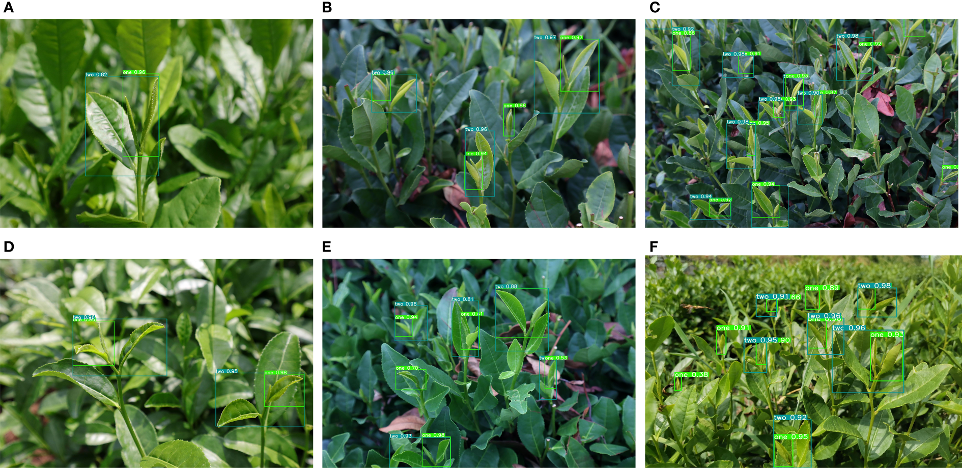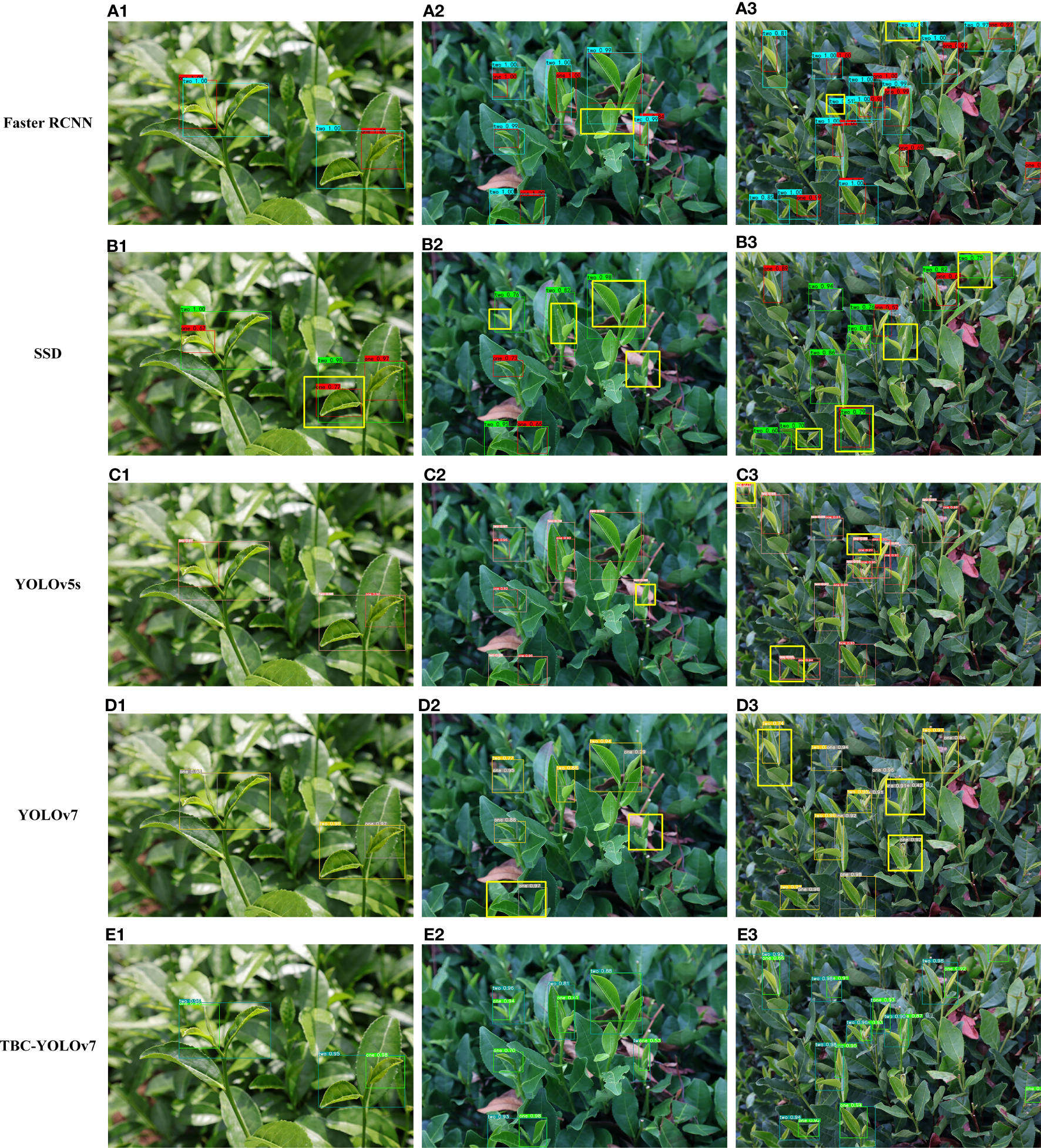 In 2022, China's tea plantations covered an area of 49,954,000 square meters, with a 2.03% increase compared to the previous year, and tea production reached a total of 3.810 million tons (Mei and Zhang, 2022). The total global tea production has maintained growing trend. With the growing tea cultivation scale and increasing tea varieties, consumers have put forward higher requirements for tea harvesting as well as processing techniques. Meanwhile, it is noteworthy to efficiently detect tea product quality should be further improved to meet the demand for larger-scale premium tea products. The grade of tea buds is an essential factor in determining the economic value of the product. During the processing of tea sprouts picking, different picking points can lead to different tea quality (Yang et al., 2021). Typically, the number of leaves is one of the important factors in determining the quality level of tea, such as having one bud with one leaf, and one bud with two leaves. Precise grading of tea buds is essential before implementing selective picking strategies (Xu et al., 2022). Tea bud target detection in complex backgrounds poses challenges due to small size of tea buds, similarity between tea buds and tea leaves, and blending between tea buds and their environment. Moreover, occlusion of tea leaves and tea buds complicate the detection. Variations in lighting and environment increase noise and interference, which also adds additional challenges. Despite previous efforts, persistent challenges require further advancements for effective detection. Yang et al. (2019) have proposed a residual network block structure in the down-sampling section of the YOLOv3 algorithm and replaced the fully connected layer with a 1×1 convolution operation, resulting in an accuracy rate exceeding 90% for identifying high-quality tea buds with various poses and types in the case where the image background is relatively simple and the dataset contains only one tea bud target. In a similar vein, Li S, et al. (2022) used the YOLOv3 algorithm and spatial pyramid module to compress the model scale by channel pruning and hierarchical pruning algorithms, significantly improving detection speed in the practical environment. However, the task only distinguished the angle of tea buds. Therefore, improving the accuracy of detection and grading of tea buds based on complex background becomes the main purpose of this paper. The contributions of this study are as follows: