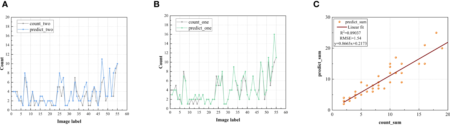 The results of the experiments indicate that the TBC-YOLOv7 is effective in all grades of samples in the test set. Specifically, the model achieves a precision of 88.2% and 86.9%, with corresponding recall of 81% and 75.9%. The mean average precision of the model reaches 87.5%, 3.4% higher than the original YOLOv7, with average precision values of up to 90% for one bud with one leaf. Furthermore, the F1 score reaches 0.83. The model’s performance outperforms the YOLOv7 model in terms of the number of parameters. Finally, the results of the model detection exhibit a high degree of correlation with the actual manual annotation results ( =0.89), with the root mean square error of 1.54.