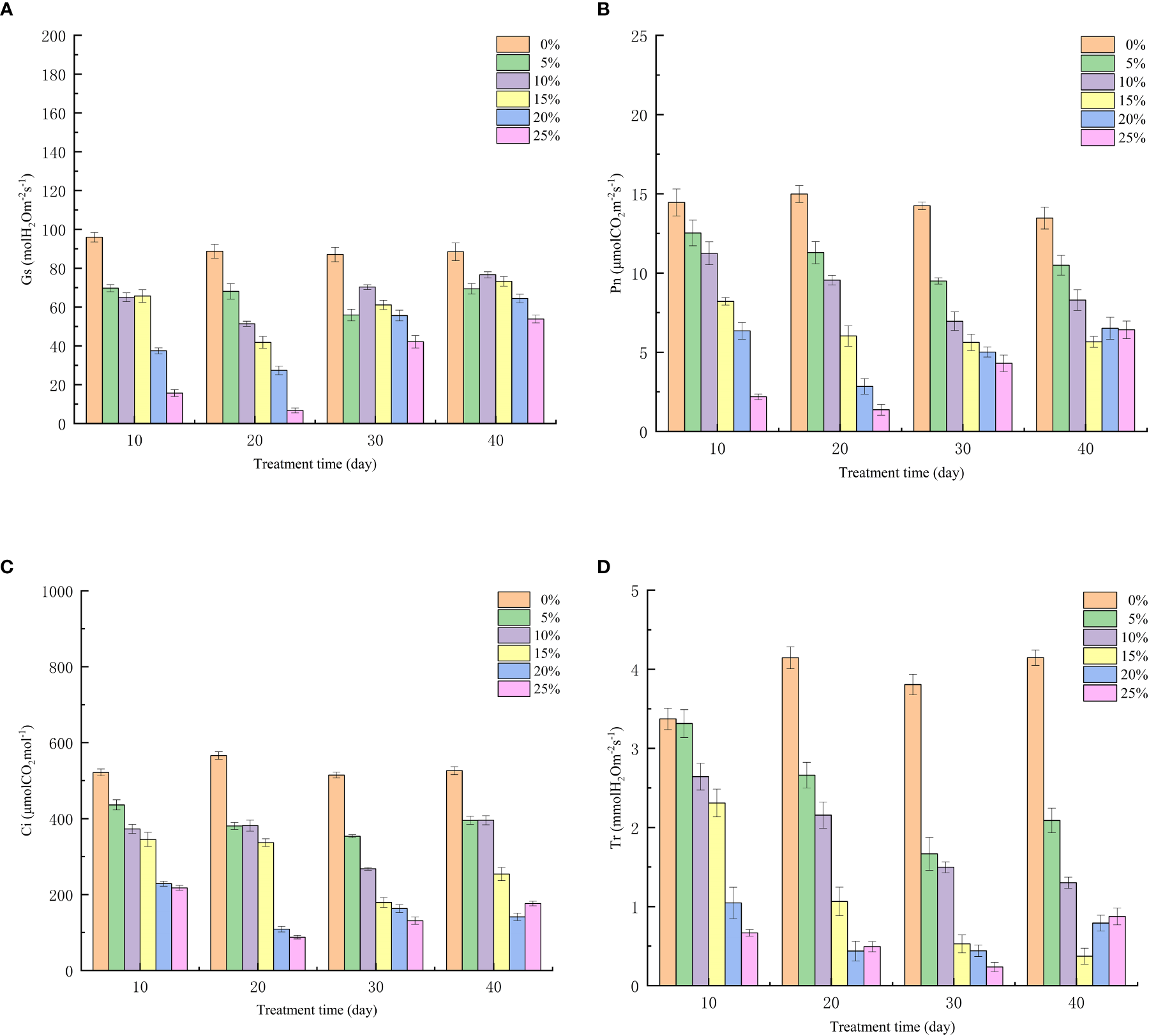 Effect of Different PEG Concentrations on Photosynthetic Parameters of European Betula platyphylla (A) Gs, (B) Pn, (C) Ci, (D) Tr.