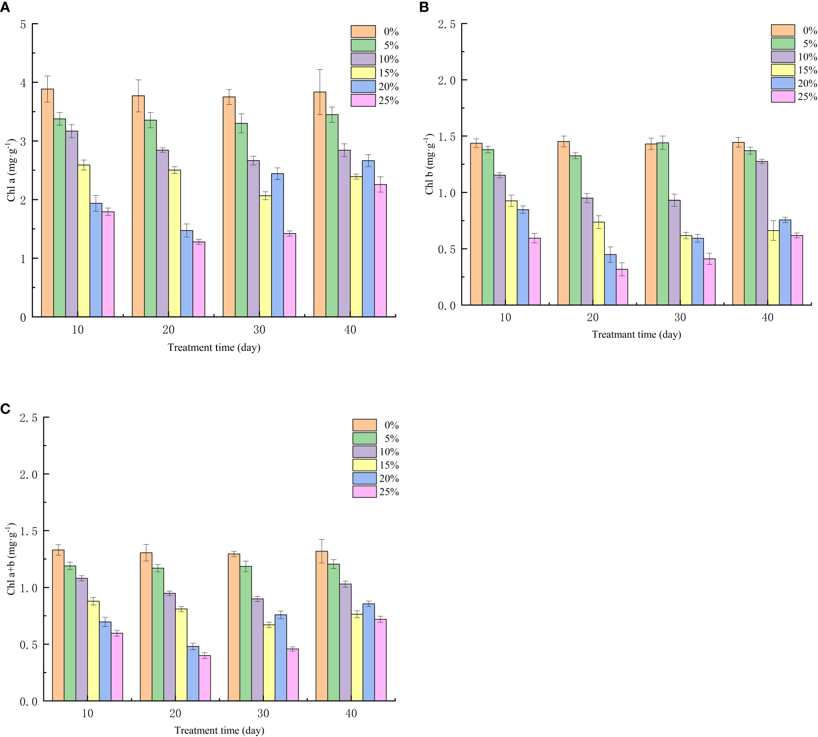 Effect of Different PEG Concentrations on Photosynthetic Pigments of European Betula platyphylla (A) Chla, (B) chlb, (C) chl a+b.