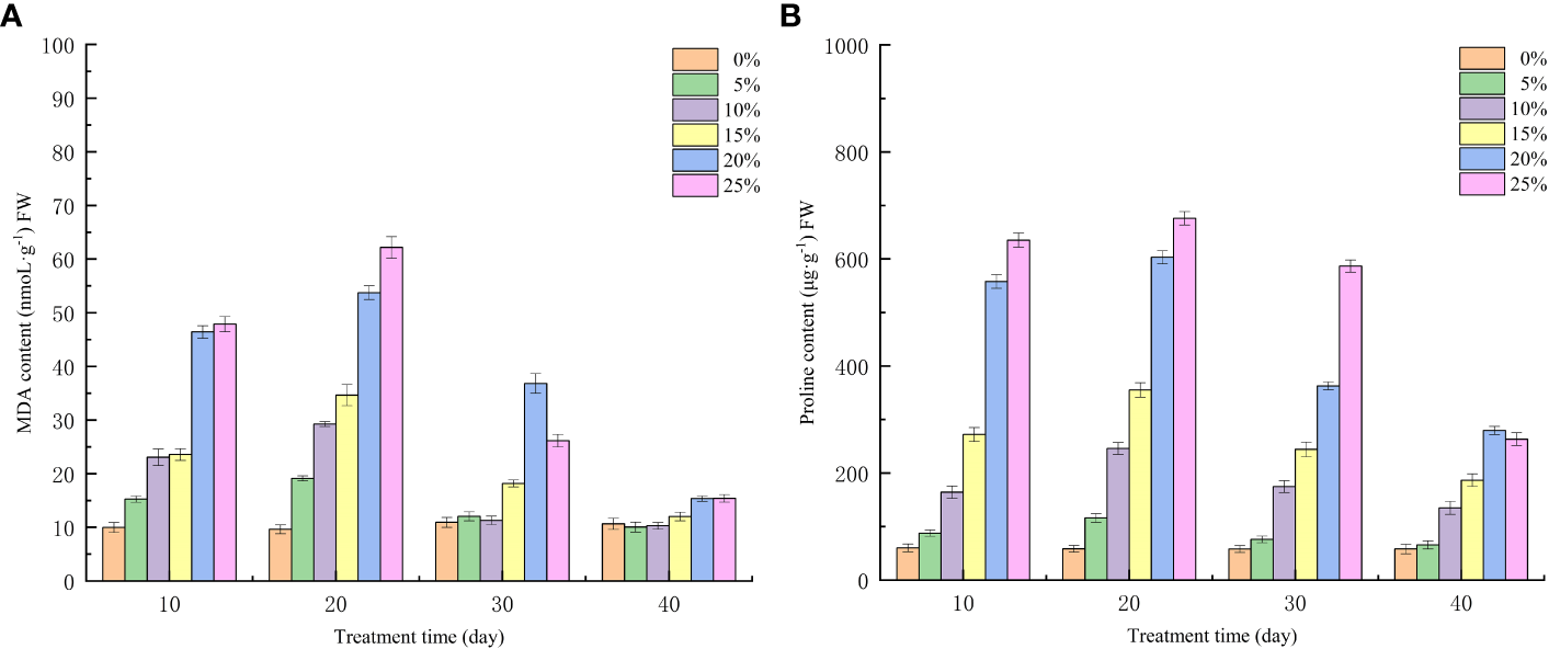 Effects of different PEG concentration on membrane lipid peroxidation and osmoregulatory substances in European birch seedlings (A) MDA (B) Proline.