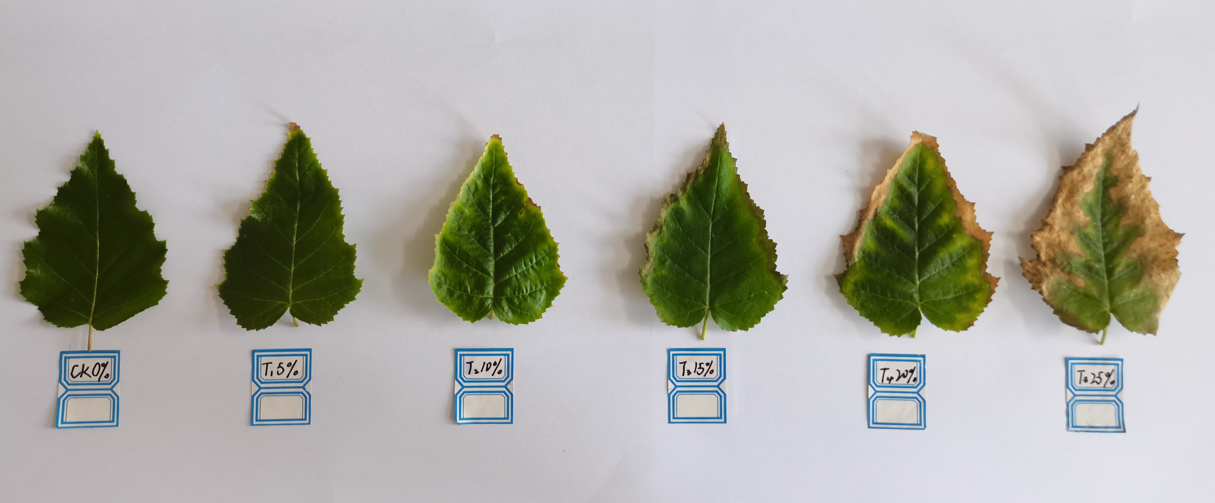 Figure 5 shows how the leaf shape of European birch seedlings was strongly impacted by various concentrations of PEG drought stress. Compared to the CK group, the seedlings’ leaf color and shape changed after 20 days of PEG treatment. The color of the leaf margin started to lighten in the T2 treatment group, and the leaf veins started to extend around the fold contraction. In the T3 treatment group, the leaf margin started to turn brown, and the leaf color gradually changed from dark to light and spread to the inside. The aforementioned symptoms were more distinct under the higher concentration of PEG treatment, especially the leaves of seedlings in the T5 treatment group, which showed dry and curled near the edge of death near the edge of the fold contraction.
