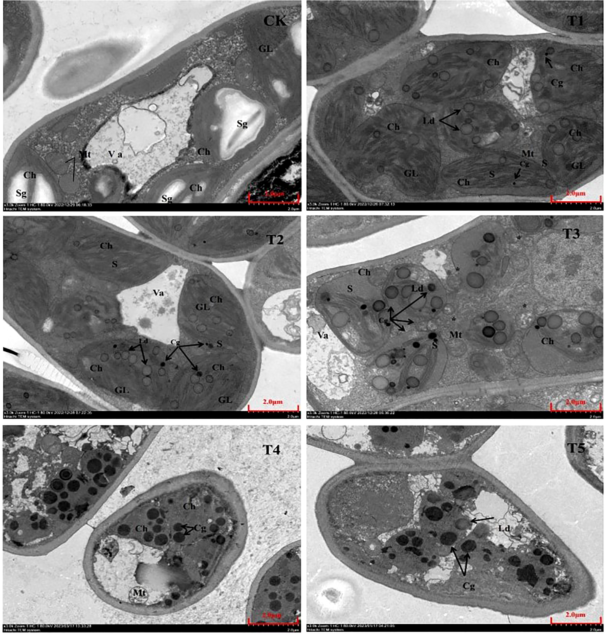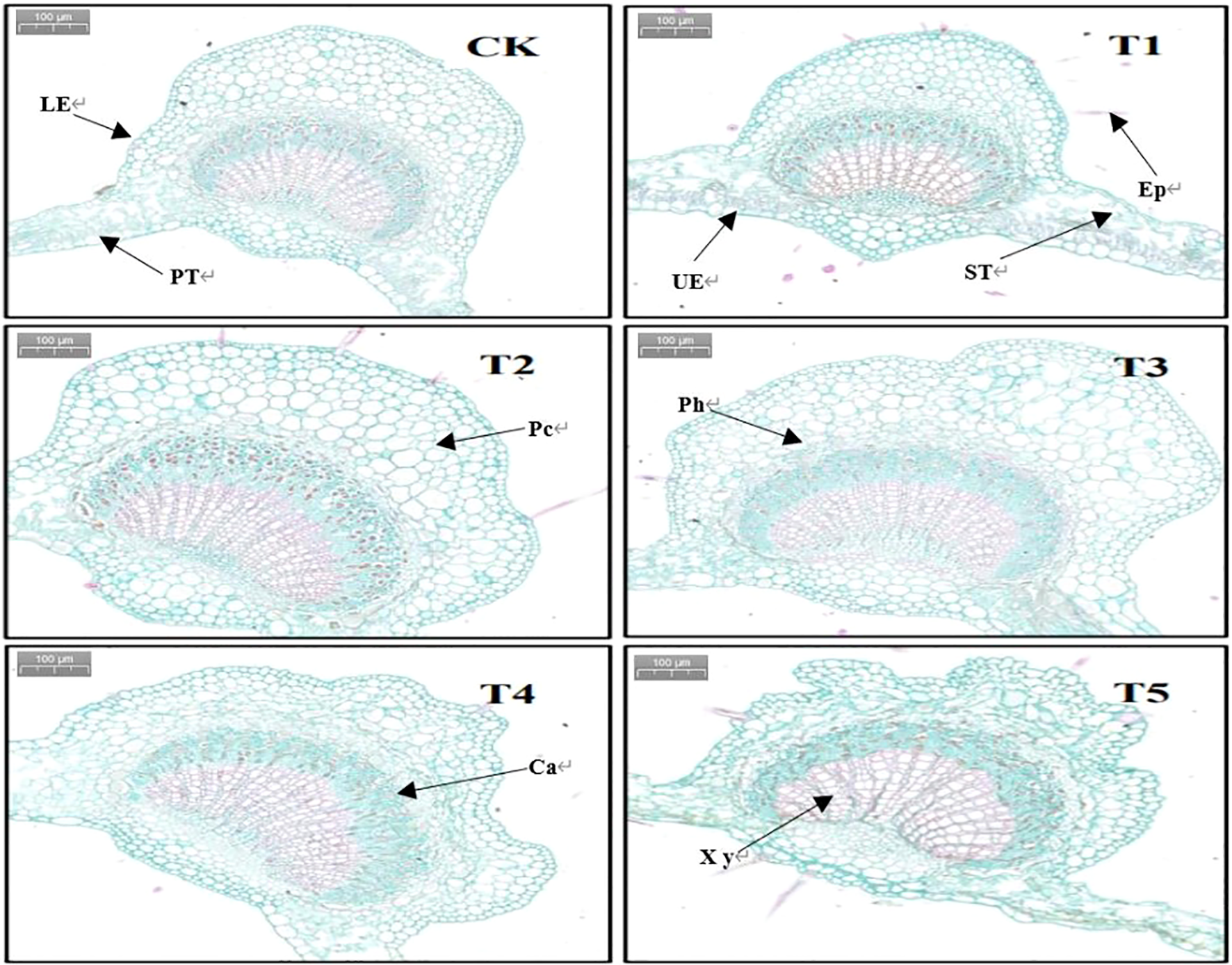 After 10 days of treatment with various concentrations of PEG, European birch seedlings had their leaves collected, cut into small pieces measuring 5 mm by 5 mm, fixed with FAA for more than 24 hours, dehydrated with an alcohol gradient, and embedded in paraffin to create sections. The leaf anatomical structures were then examined under a microscope after stress. With a few minor alterations, leaf stomatal morphology observation sample processing was carried out using the Regulus 8100 scanning electron microscope. Stomatal observation was then completed(Raza et al., 2020). With a few minor adjustments, the procedure of (Kong et al., 2013) was used to generate leaf organelle structures. After that, the organelles were seen using a Hitachi TEM system.