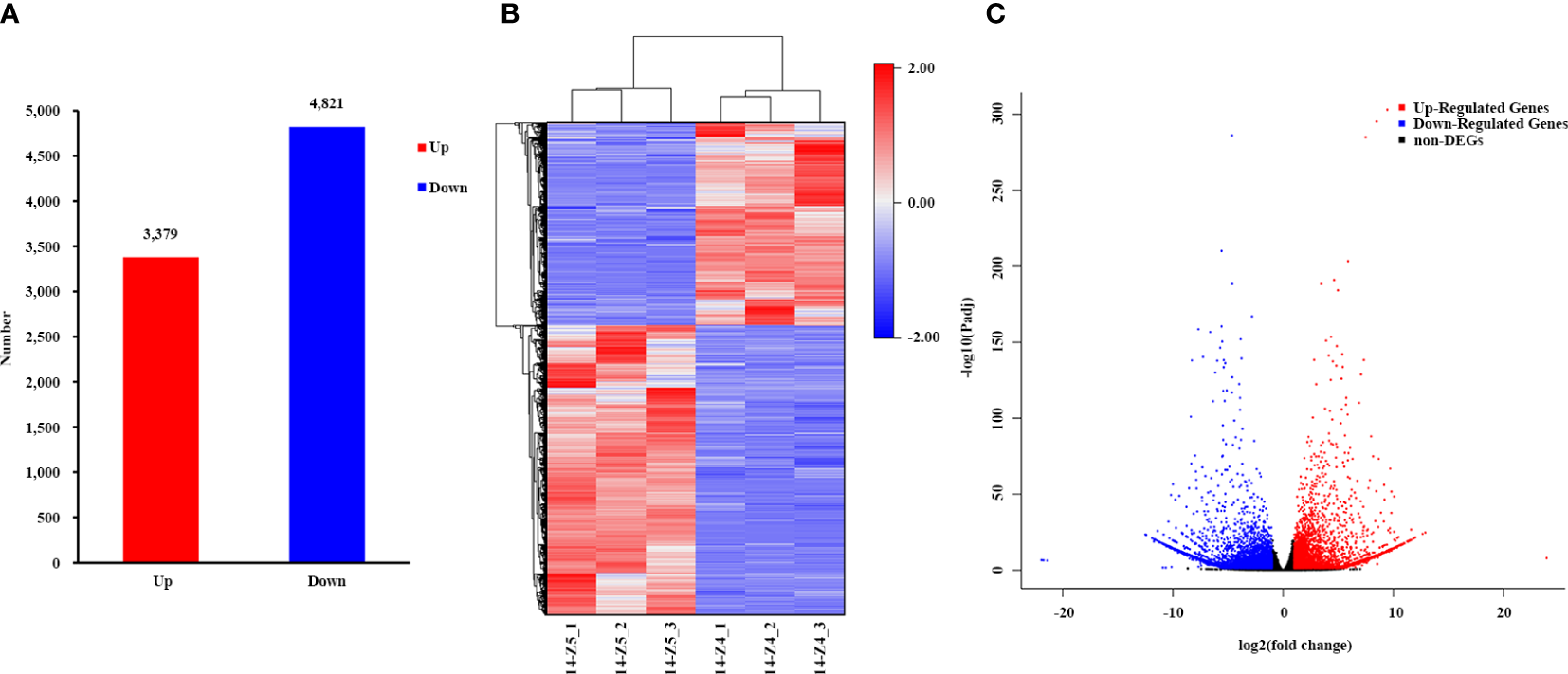 Differential expression analysis in 14-Z4 compared to 14-Z5. (A) Then column diagram of the number of upregulated and downregulated genes. The y-axis indicates the number of upregulated and downregulated genes in 14-Z4 vs 14-Z5. (B) The cluster heatmap of DEGs in each sample. (C) The volcano map of transcriptome. The red dots indicate significantly up-regulated genes, blue dots indicate significantly down-regulated genes, and gray dots indicate genes with no significant difference in expression.