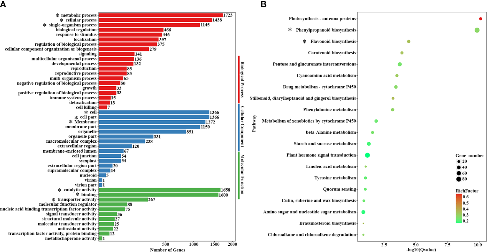 GO classification statistics and KEGG enrichment analysis. (A) GO classification analyses of DEGs of 14-Z4 vs 14-Z5. DEGs were classified into three main categories: cellular component, biological process, and molecular function. (B) KEGG pathway enrichment analyses of 14-Z4 vs 14-Z5. Important terms and pathways were marked with *.