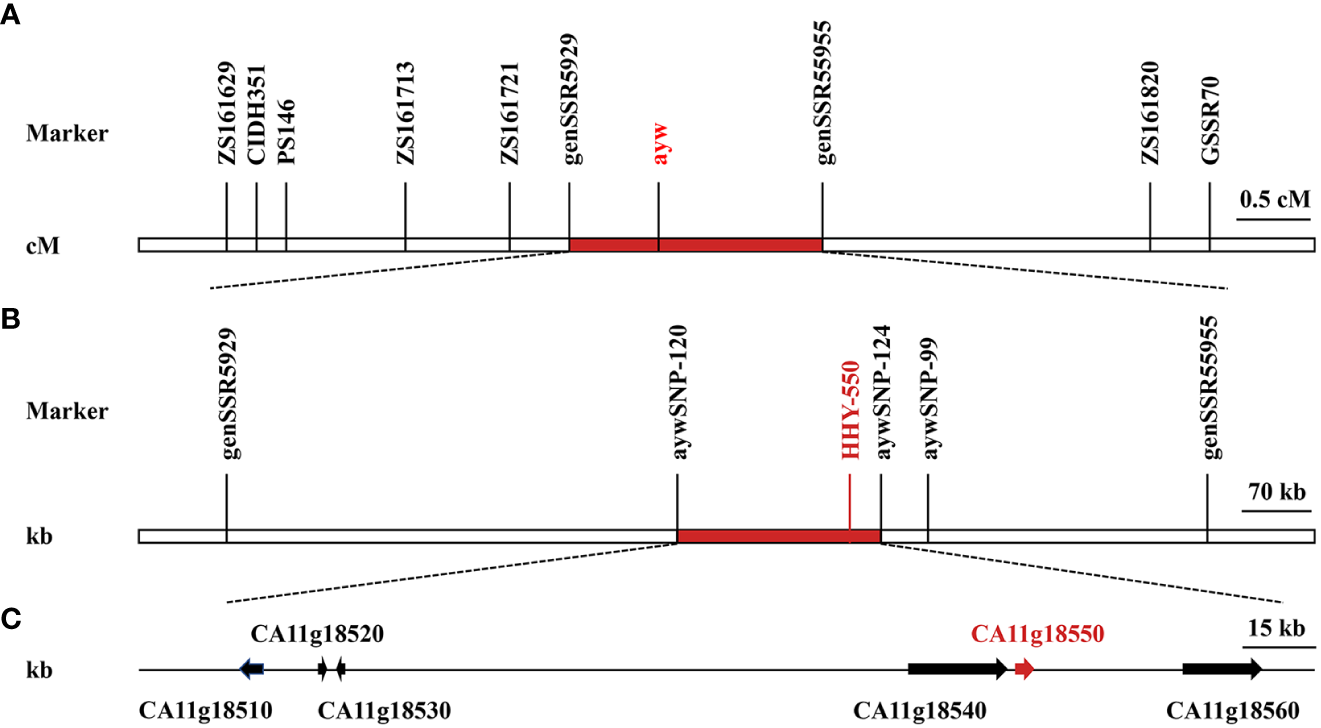In addition, there were four missense mutations in exon of CA11g18550 between 14-Z4 and 14-Z5, and the KASPar marker aywSNP550 was designed according to the SNP mutation on +835bp of CA11g18550, which co-segregated with the color of anthers and stems of the F2 population. The expression level of CA11g18550 in purple anthers and stems was significantly higher than in yellow anthers and green stems. At the same time, silencing CA11g18550 through VIGS causes purple stems to turn green (Figure 7B). Therefore, based on all the evidence above, CA11g18550 was identified as a strong candidate gene for ayw locus in pepper.