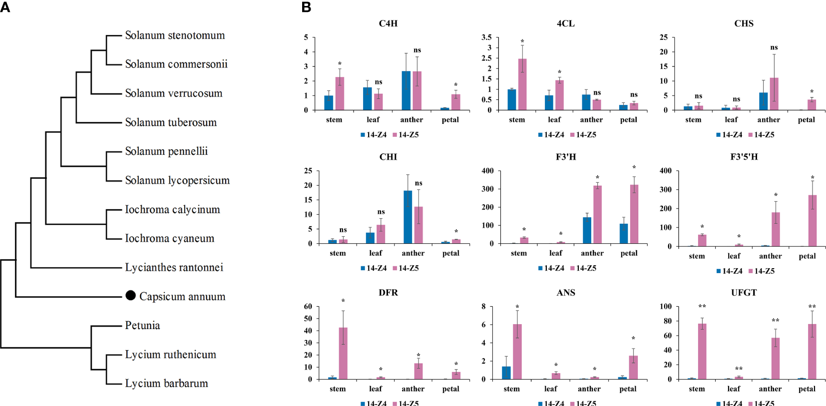 Phylogenetic tree of F3’5’H and transcriptional level of anthocyanin structure gene. (A) Phylogenetic tree of F3’5’H proteins in pepper and other species. Accession number for the respective protein sequences were as follows: Lycium ruthenicum (AGT57963.1); Iochroma calycinum (AIY22750.1); Lycium barbarum (AGT57962.1); Iochroma cyaneum (AIY22752.1); Lycianthes rantonnei (AAG49300.1); Solanum pennellii (NP_001361341.1); Solanum stenotomum (XP_049380725.1); Solanum lycopersicum (NP_001234840.2); Solanum verrucosum (XP_049353506.1); Solanum commersonii (KAG5577898.1); Solanum tuberosum (BAJ09746.1); Petunia x hybrida (P48419.1). CA11g18550 was highlighted with black dot. (B) Transcriptional level of anthocyanin structure gene in stems, leaves, anthers and petals between 14-Z4 and 14-Z5. The error bars represent the standard deviation of measurements for three replicates in 14-Z4 and 14-Z5. Asterisks indicated a statistically significant difference between varieties (*p < 0.05; **p < 0.01; ns p ≥ 0.05; t-test).