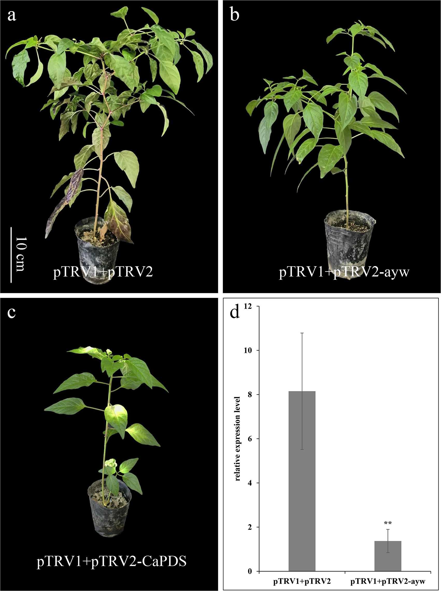 Virus−induced gene silencing was used to investigate gene function (Liu et al., 2002). Primers were designed using Primer 5 software (forward primer: ACCGAATTCTCTAGATGTTGCTTCTACTCCTAATGCAGCT, and reverse primer: CGTGAGCTCGGTACCTTTTGTGTAATTTTTTCATCCCTCT). The ayw fragment (500 bp) was PCR amplified using Primer STAR MAX DNA Polymerase 045A (Takara, Japan) from pepper cDNA. The constructs consisting of pTRV1, pTRV2, pTRV2-PDS, pTRV2-ayw were transformed into Agrobacterium tumefaciens GV3101, respectively. The transformed cells were cultured in the Luria–Bertani (LB) medium until the OD600 was 1.0-1.2 and then harvested and re-suspended in the MS buffer (200 μM acetosyringone, 10 mM MES, 10 mM MgCl2, pH = 5.8) to a final OD600 of approximately 1.0. The pTRV1 and the pTRV2, pTRV2-PDS and pTRV2-ayw were mixed in a 1:1 (v/v) ratio, respectively. The mixtures were accomplished using 1 mL syringe without the needle into cotyledons of 3-week-old seedlings. The infiltrated plants were grown in a growth chamber at 22°C, 16 h light/8 h darkness.