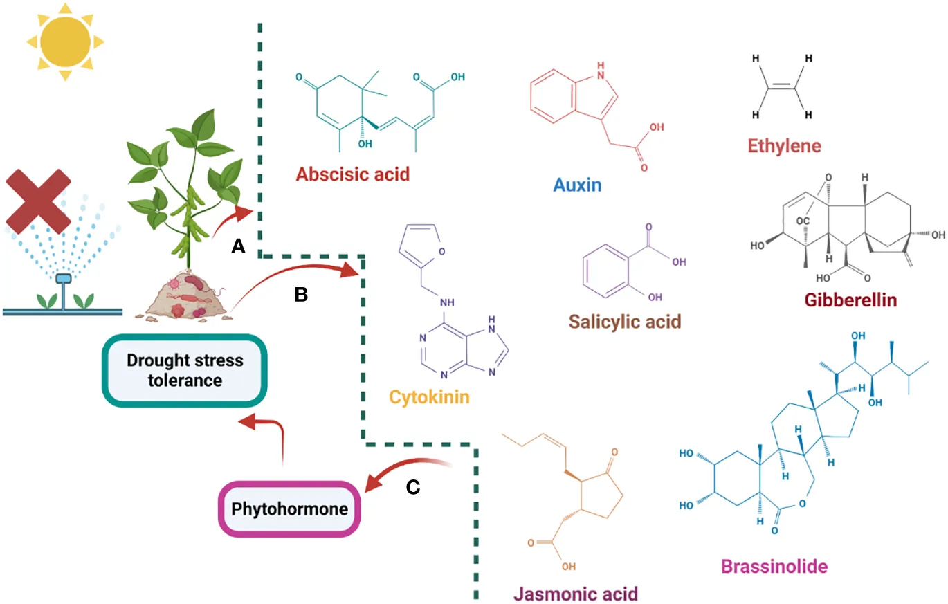 A schematic representation of the phytohormone modulates drought stress tolerance where (A) represents the endogamous phytohormone modulation, (B) represents the activation of phytohormones via application of the microorganism (C) represents the exogenous application of phytohormones regulates the drought stress tolerance.