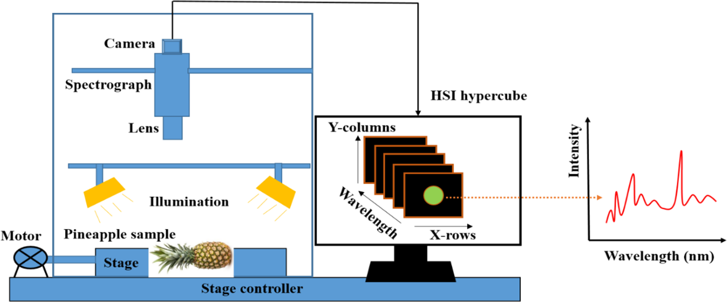 Computer vision and popular pre-trained convolutional neural network (CNN) models have been used as recognition systems to sort and grade different fruits and vegetables, especially in supermarkets, regarding their variety and species (Dubey and Jalal, 2012). However, computer vision can only assess external quality attributes due to the lack of spectral information (Rahman and Cho, 2016; Bhargava and Bansal, 2021). Acoustic emission technology involves the mechanical destruction of produce when subjected to mechanical or thermal stimulus (Aboonajmi et al., 2015) and is not appropriate for all categories of fruits and vegetables (Adedeji et al, 2020 ). Extensive works have been published on the evaluation of fruits and vegetables by spectral measurements such as Fourier transform infrared (FTIR) spectroscopy (Egidio et al., 2009), Near-infrared (NIR), Raman spectroscopy (Pandiselvam et al., 2022), and hyperspectral imaging (HSI) (Wang and Zhai, 2018). Generally, these reports have concentrated on the utilization of spectral measurements for determining targeted quality parameters of a particular fruit or vegetable variety. For instance, visible and near-infrared spectroscopy was used to investigate the internal browning in mango fruits (Gabriëls et al., 2020). Ali et al. (Ali et al., 2023) investigated FTIR, NIR, and machine vision in the quality monitoring of pineapples. Metlenkin et al. (Metlenkin et al., 2022) distinguished Hass avocado fruits by defects using hyperspectral imaging (HSI). The question revolves around the practical utilization of these approaches and the challenges associated with improving data processing speed and in-line implementation (Cortés et al., 2019; Si et al., 2022). Quick hardware and software are required to fulfill the demands of swift analysis for extensive hyperspectral datasets (Xu et al., 2023) and machine learning algorithms, especially those relying on deep learning act as black boxes rather than using interpretability models for high-stakes decisions (Caceres-Hernandez et al., 2023).