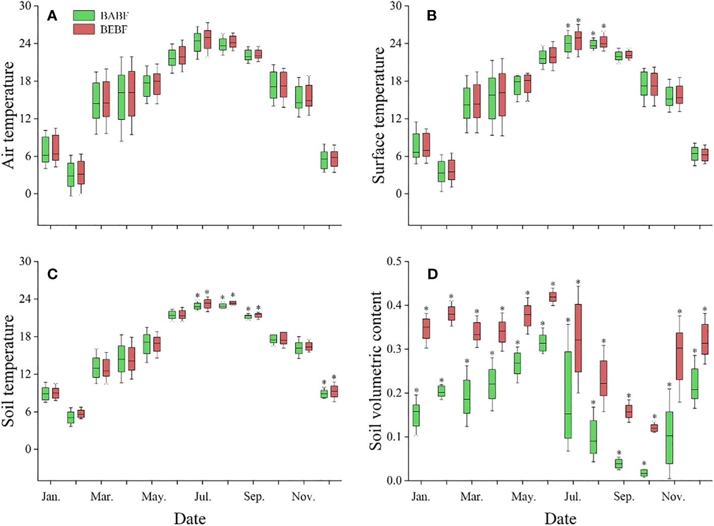 Figure 3 Monthly mean daytime meteorological values for the study period (2022, mean ± S.E.). (A) Air temperature, (B) surface temperature, (C) soil temperature, and (D) soil water content (daily means, n = 3) for BEBF (red) and BABF (green) forests are depicted. Asterisks designate significant differences between forest types (α = 0.05).