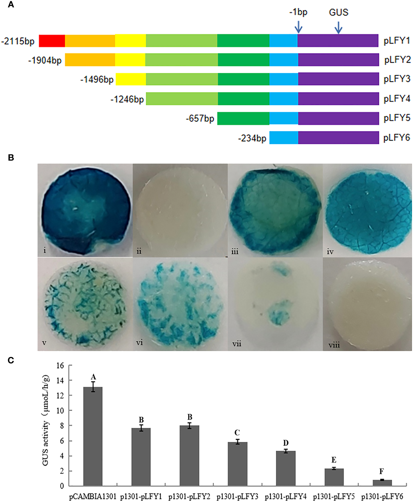 GUS staining showed that the positive control (injected Agrobacterium with pCAMBIA1301 empty vector) was stained the deepest, and the leaves of negative control (injected Agrobacterium without vector) were not stained. The other leaves from transiently transformed plants were stained except for p1301-pLFY6, of which p1301-pLFY1 and p1301-pLFY2 were stained deeply, followed by p1301-pLFY3 and p1301-pLFY 4, and p1301-pLFY5 was stained slightly (Figure 1B).
