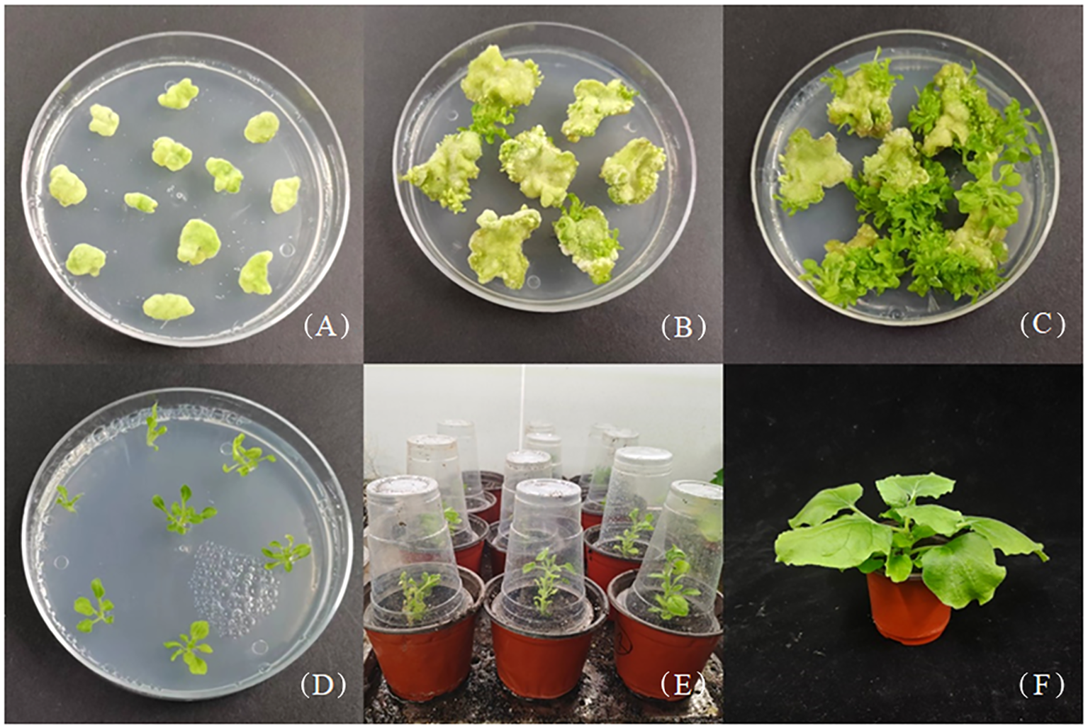 Genetic transformation of Nicotiana benthamiana with p1301-pLFY1. (A) Callus induction. (B, C) Callus differentiation and adventitious shoot elongation. (D) Rooting of adventitious shoots. (E) Transplanting. (F) Transgenic plant.