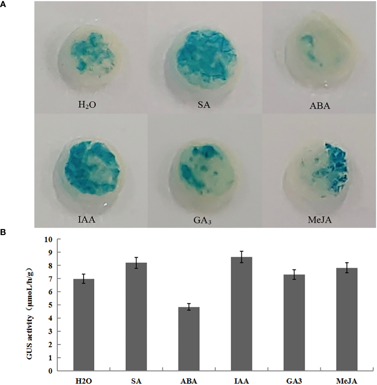 GUS histochemical staining and enzyme activity determination of transiently transformed plants treated by hormones showed that the treated transiently transformed plants with p1301-pLFY1 had higher activities than those treated by H2O (control), except for ABA, which showed lower activities than control (Figure 6). These results indicated that the p1301-pLFY1 promoter fragment responded to the induction of SA, IAA, GA3, and MeJA, and the treatments of SA, IAA, GA3, and MeJA increased the activities of JmLFY1 promoter.