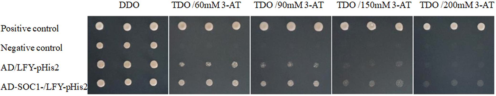 The positive control (pGADT7-rec2-p53 and pHIS2-p53), negative control (pGADT7-Rec2 and pHIS2-p53), self-activation assay (pGADT7-Rec2 and pHIS2-LFY), and interaction assay (pGADT7-SOC1 and pHIS2-LFY) were co-transformed into yeast competent cell Y187, and the yeast solution was then coated on DDO medium (SD/-Leu/-Trp) and TDO medium (SD/-His/-Leu/-Trp) with various concentrations of 3-AT (60 mM, 90 mM, 150 mM, and 200 mM). The cultures were placed upside down and incubated at 30°C for 2–4 days.