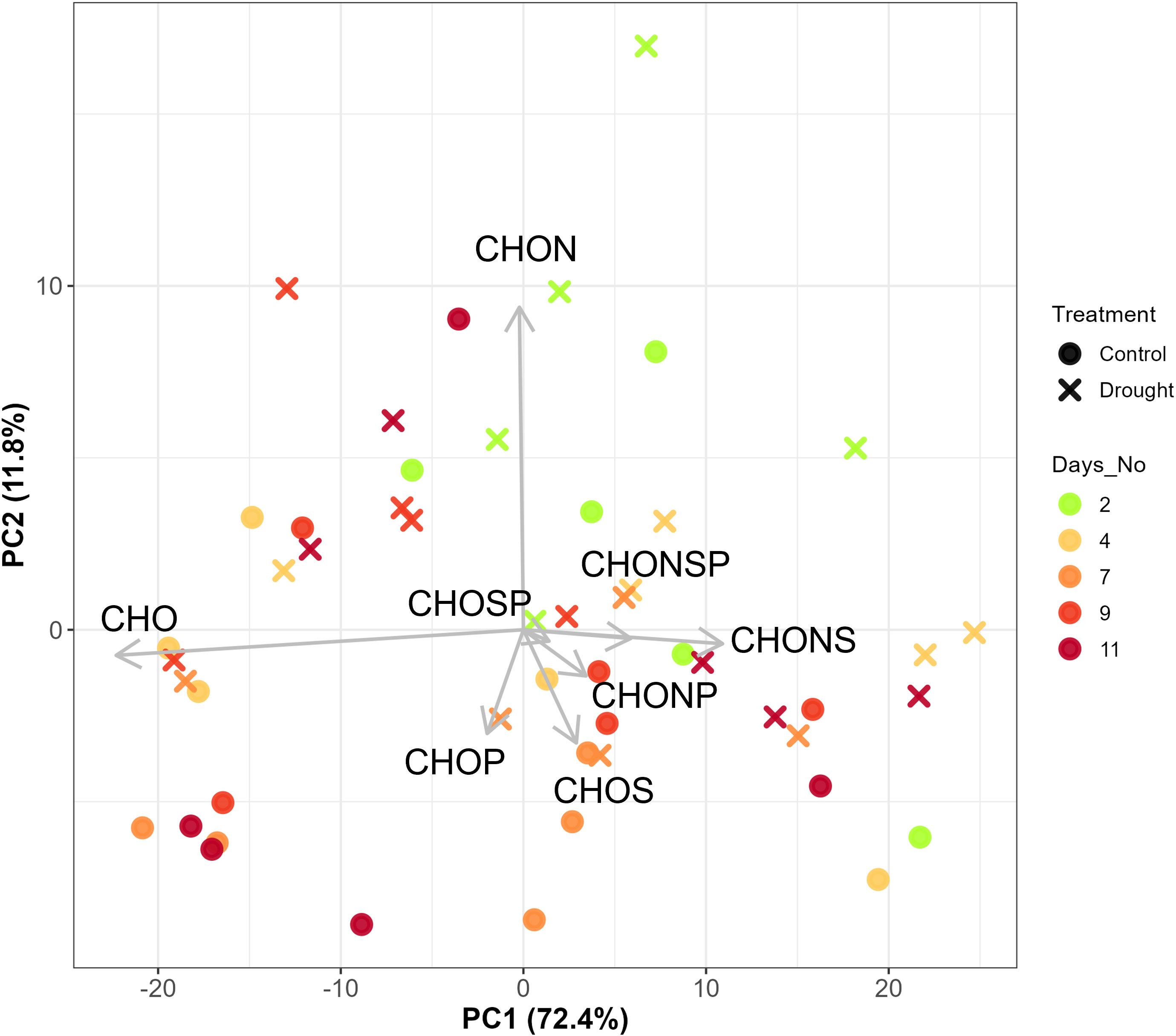 PERMANOVA showed no differences between treatment, days, and treatment × days interaction in elemental composition (i.e., CHO, CHON, CHONP, CHONS, CHONSP, CHOP, CHOS, and CHOSP) when all compounds were used. Treatment had a nearly significant effect on elemental composition (p-value=0.07) during the water-deficit phase (Table 1). PCA analysis of elemental composition showed a minor effect of treatment during water-deficit phase (Figure 3) but not at baseline or during the recovery phase (Supplementary Figure 1). Although high percentages of explained variance in PC1 (72.4%) has been observed, the treatment effect on elemental compositions during water-deficit phase was observed at PC2 with 11.8% explained variance and the variation was mostly driven by CHO and CHON (Figure 3).