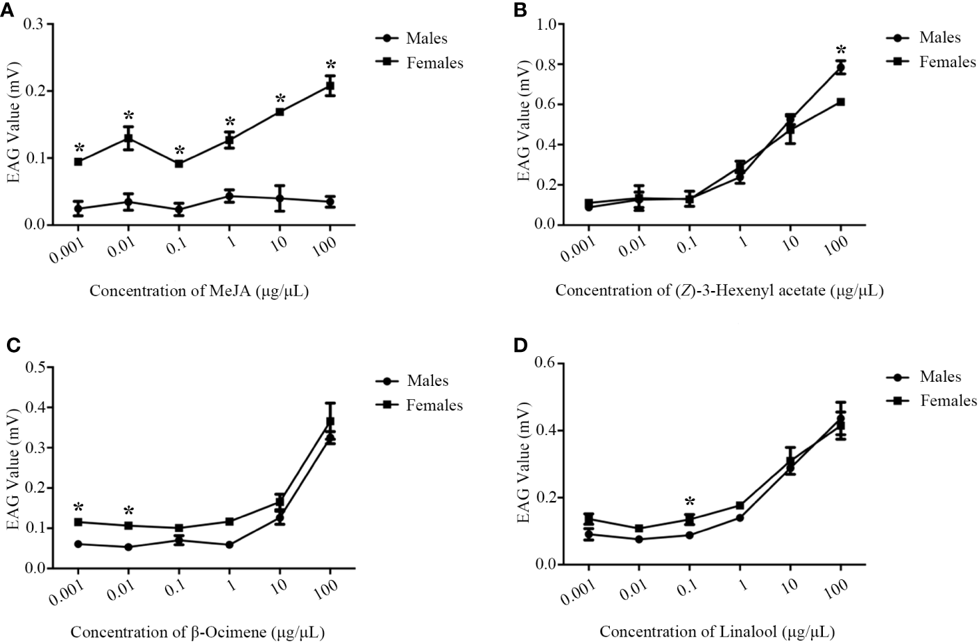 The dose-dependent manner of M. mediator antennae to MeJA (A), β-ocimene (B), (Z)-3-hexenyl acetate (C) and linalool (D). The asterisk indicates significant difference (P < 0.05).