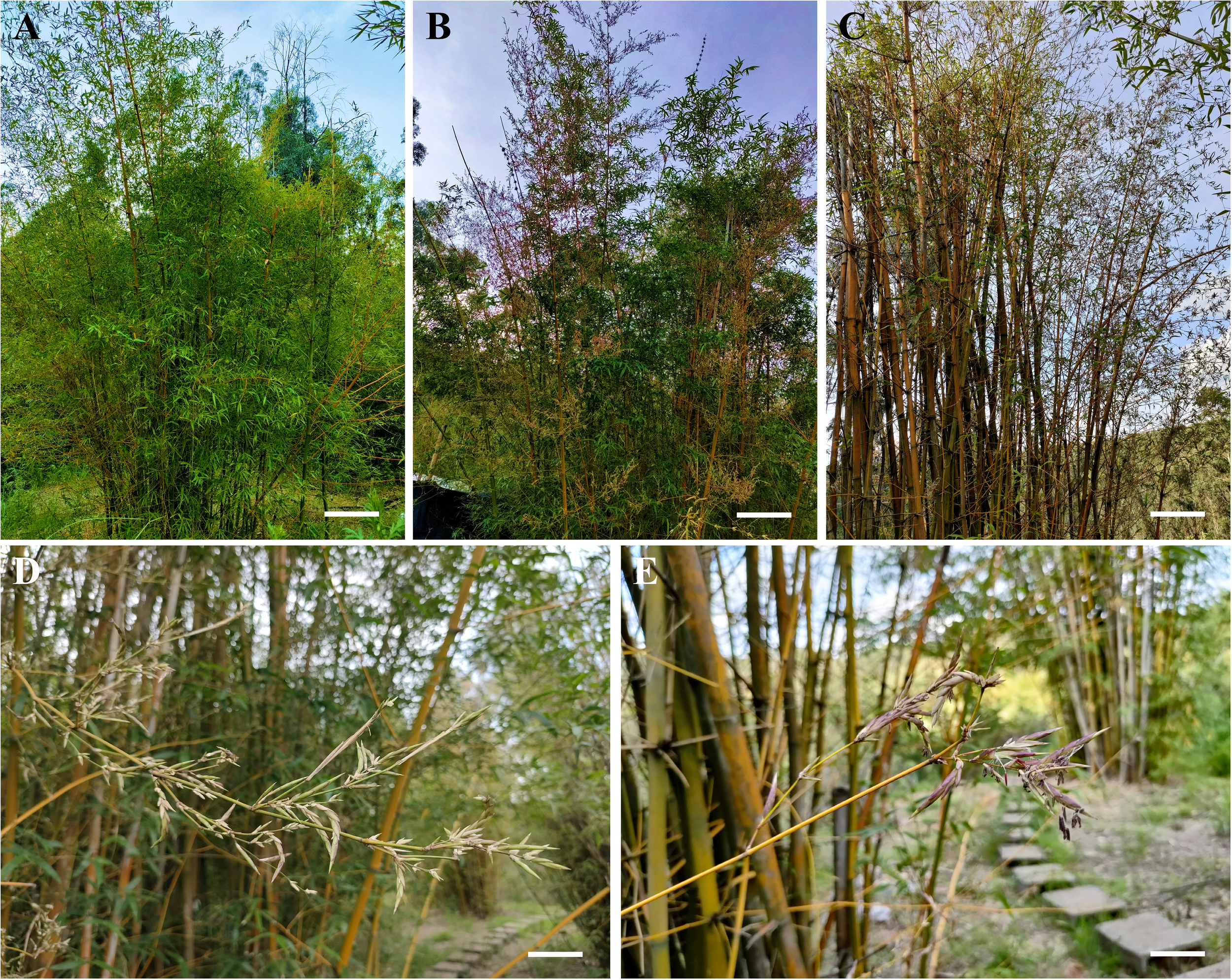 The difference in the growth of non-flowering and flowering B. tuldoides culms. (A) Non-flowering B. tuldoides culms. Bar=30cm. (B, C) Flowering B. tuldoides culms. Bar=20cm. (D, E) Morphology and growth of spikelets. Bar=3cm.
