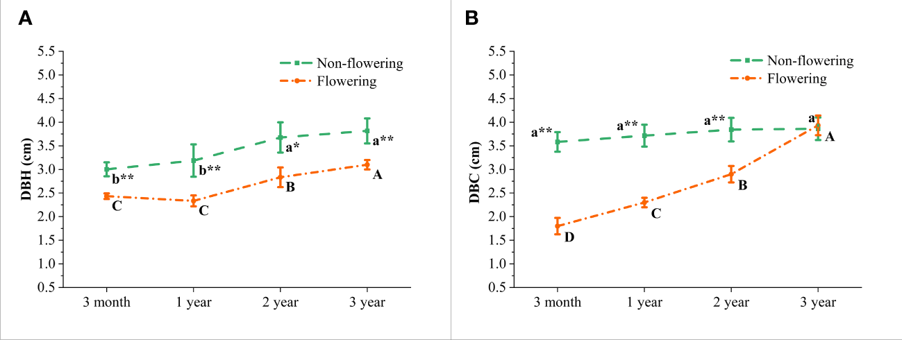 Morphology in the non-flowering and flowering B.tuldoides culms of different ages. (A) Changes of the diameter at breast height (DBH) of culms. (B) Changes of the diameter at culm bottom (DBC) of culms. Data were presented as mean ± SD (n=3). Different lowercase letters indicated significant differences with age in the non-flowering culms, and different uppercase indicated differences with age in the flowering culms at the level of p<0.05. * indicated significant difference at the level of p<0.05, and ** indicated significant difference at the level of p<0.01 between the non-flowering and flowering culms.