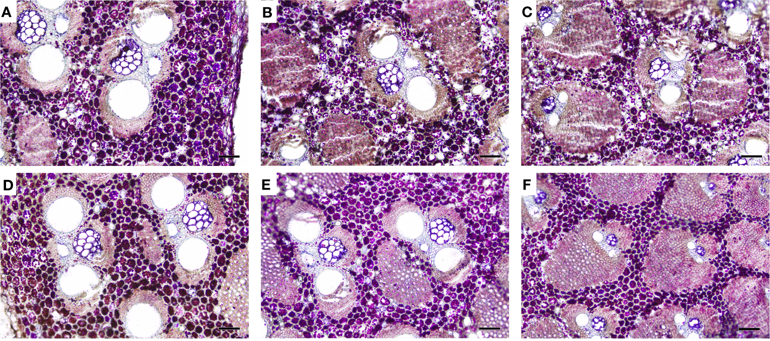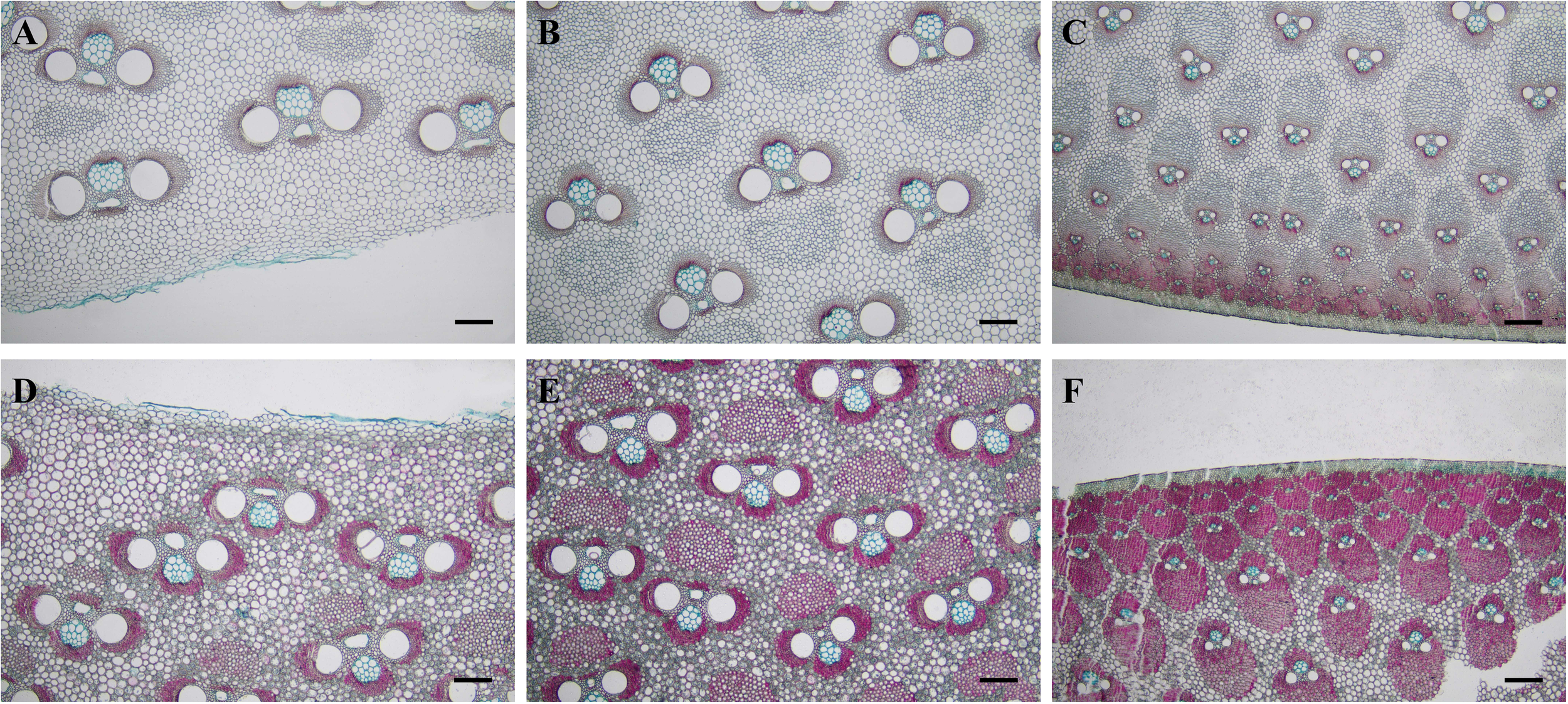 Vascular bundle morphology of B. tuldoides culms after the staining with safranin O and alcian blue. Each internode sample was cut into 15 cross-sections continuously for the observations. (A–C) Inner, middle, and outer zones in the 3-month-old culms. Bar=200 μm. (D–F) Inner, middle, and outer zones in the 1-year-old culms. Bar=200 μm.