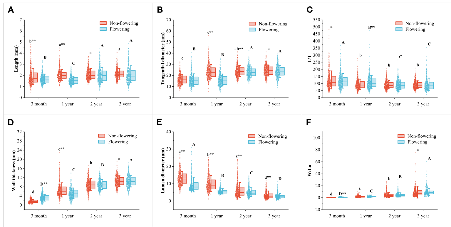 Changes of the fiber characteristics in the non-flowering and flowering B. tuldoides culms with age. Each determination was repeated three times and a total of 150 fibers were measured each time. (A) Length. (B) Tangential diameter. (C) L/T. (D) Wall thickness. (E) Lumen diameter. (F) W/Lu. Different lowercase letters indicated significant differences with age in the non-flowering culms and different uppercase indicated differences with age in the flowering culms at the level of p<0.05. ** indicated significant difference at the level of p<0.01 between the non-flowering and flowering culms.