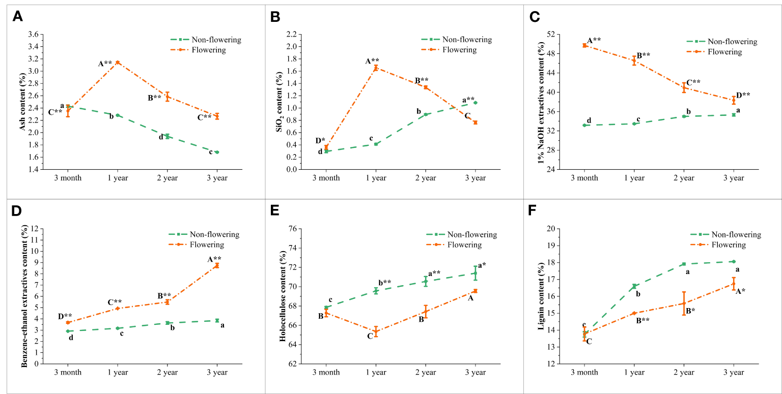 Changes of the major chemical components in the non-flowering and flowering B.tuldoides culms of different ages. Data were presented as mean ± SD (n=3). (A) Ash content. (B) SiO2 content. (C) 1% NaOH extractives content. (D) Benzene-ethanol extractives content (E) Holocellulose content. (F) Lignin content. Different lowercase letters indicated significant differences with ages in the non-flowering culms and different uppercase indicated differences with ages in the flowering culms at the level of p<0.05. * indicated significant difference at the level of p<0.05, and ** indicated significant difference at the level of p<0.01 between the non-flowering and flowering culms.