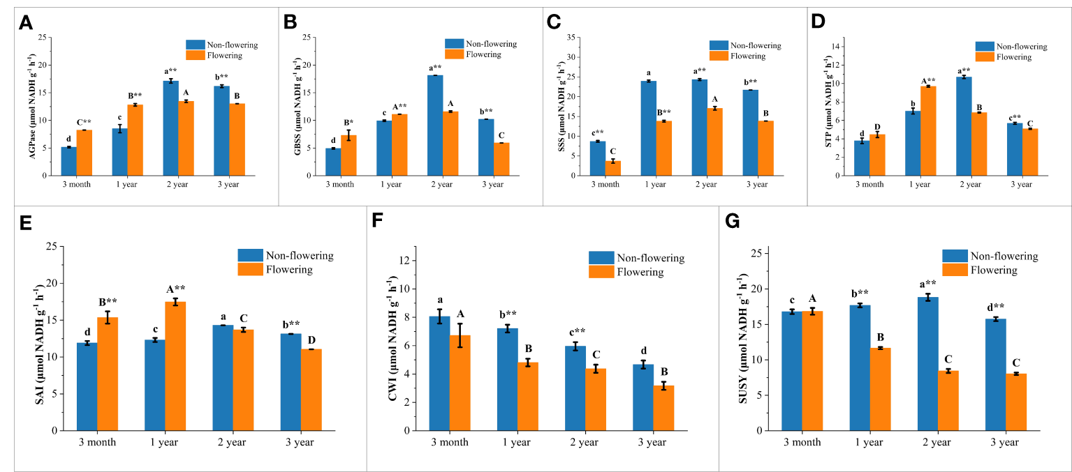 Changes of sugar-metabolizing enzymatic activities in the non-flowering and flowering B.tuldoides culms of different ages. Data were presented as mean ± SD (n=3). (A) AGPase activities. (B) SSS activities. (C) GBSS activities. (D) STP activities. (E) SAI activities. (F) CWI activities. (G) SUSY activities. Different lowercase letters indicated significant differences with age in the non-flowering culms and different uppercase indicated differences with age in the flowering culms at the level of p<0.05. * indicated significant difference at the level of p<0.05, and ** indicated significant difference at the level of p<0.01 between the non-flowering and flowering culms.