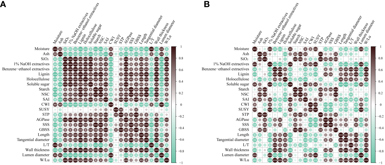 Correlation analysis of physiological indexes in B. tuldoides of different ages. (A) Correlation analysis of physiological indexes in the non-flowering culms. (B) Correlation analysis of physiological indexes in the flowering culms. The darkness of the color indicated the ranking: the black circle marked the value of positive correlation, and the green circle marked the value of negative correlation. * indicated significant correlation at 0.05 level, ** indicated significant correlation at 0.01 level, and *** indicated significant correlation at 0.001 level.