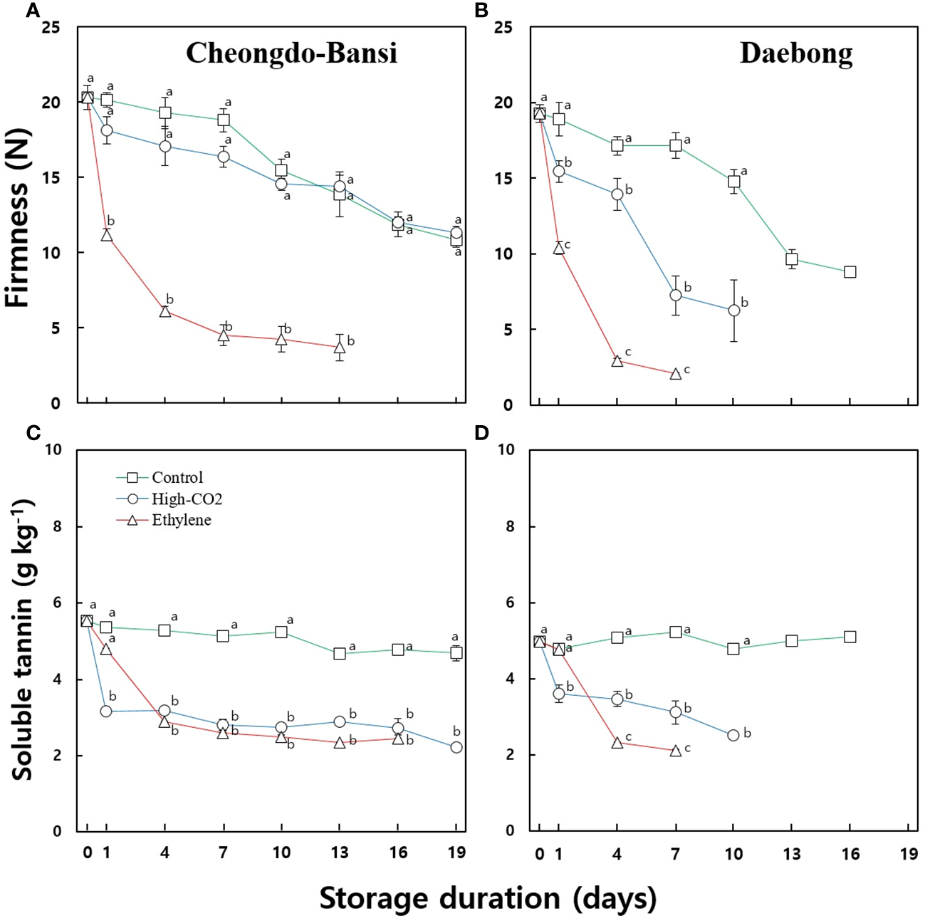 Changes in firmness and soluble tannin content of the control and ethylene or high CO2 treated ‘Cheongdo-Bansi’ (A, C) and ‘Daebong’ (B, D) persimmon fruit during storage at 22°C. Each data point indicates 5-10 fruits. The number of fruit at each measurement day was started with five fruits at the beginning of the storage and decided afterward to 5-10 fruits for each measurement based on the fruit status.