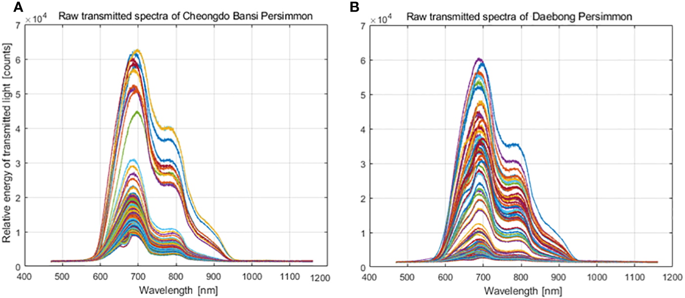 In this study, transmittance energy spectra of ‘Cheongdo-Bansi’ and ‘Daebong’ intact astringent persimmon fruit were recorded by VNIR spectrometer (Figures 3A, B) in the wavelength of 500-1000 nm as shown in Figures 2A, B. As indicated in Figure 2, differences were observed in the raw transmitted spectra characteristics of the two cultivars. More scattered spectra were observed in ‘Cheongdo-Bansi’ than ‘Daebong’.