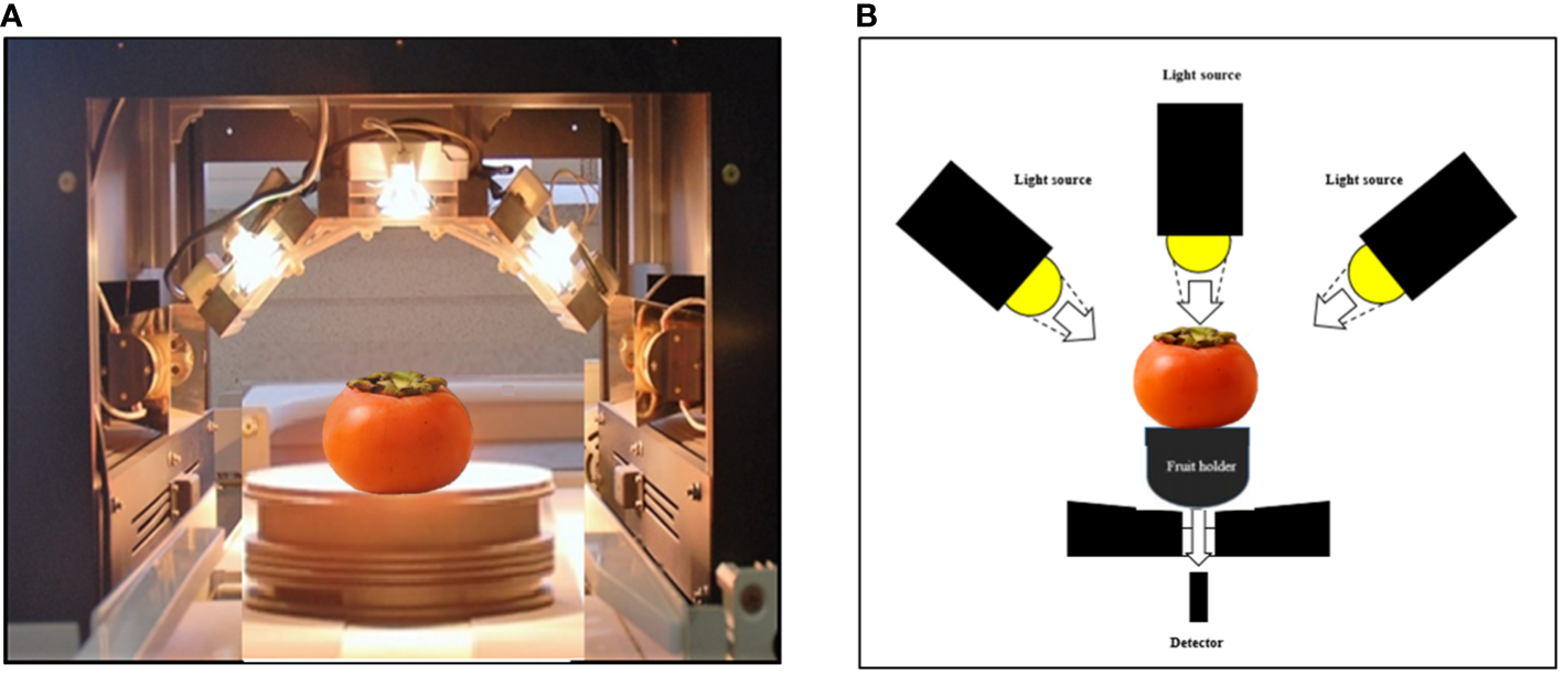 VNIR spectrometer (A) and measurement system (B) during transmittance spectra measurement of intact persimmon fruits.