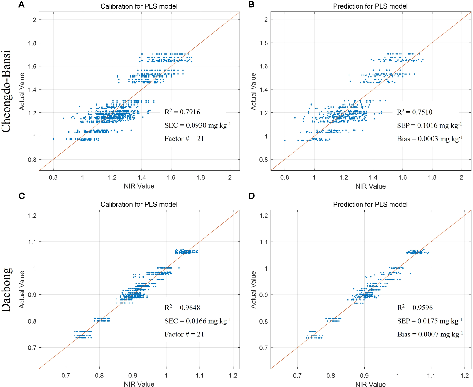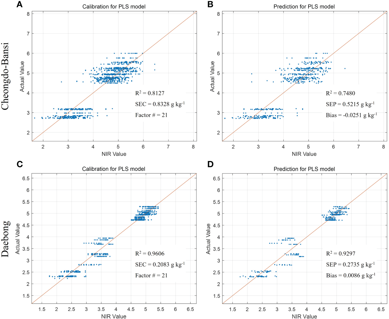 Measured vs. predicted values of tannin content (g kg-1) in ‘Cheongdo-Bansi’ for calibration (A) and prediction (B), and ‘Daebong’ for calibration (C) and prediction (D) sets with PLS models. The scatter plot depicts the prediction accuracy of the model. The x axis represents the predicted value of tannin content and the y axis represents the measured value by the PLS models.