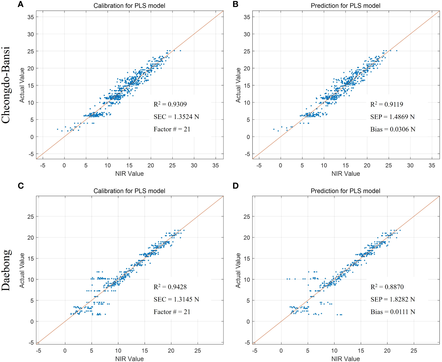 Measured vs. predicted values of firmness (N) in ‘Cheongdo-Bansi’ for calibration (A) and prediction (B), and ‘Daebong’ for calibration (C) and prediction (D) sets with PLS models. The scatter plot depicts the prediction accuracy of the model. The x axis represents the predicted values of firmness and the y axis represents the measured value by the PLS models.
